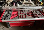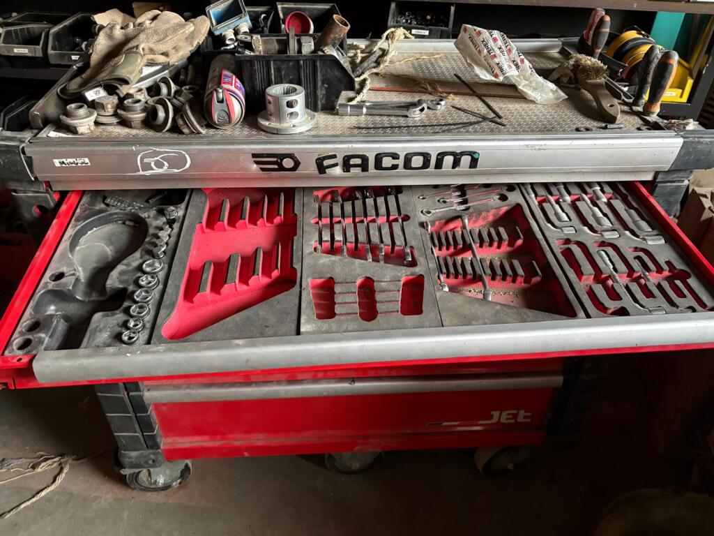 Servante à outils FACOM avec serrure absente, 1er tiroir endommagé et quelques outils