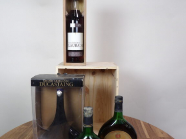 4 flacons dont un grand Armagnac Ducastaing, 2 x Ch. Labourdette 1975 et un Bas Armagnac Laubade 1976 (niveaux bas)