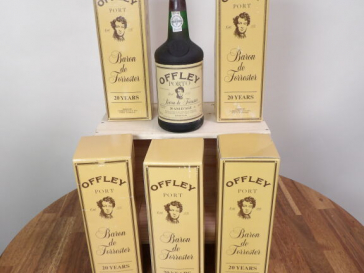 Porto Offley : 5 bouteilles (75 cl) de 20 ans d'âge Baron de Forrester, boîtes carton abîmées