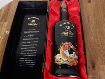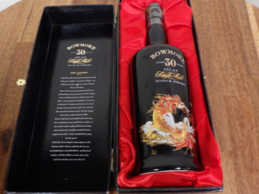 Scotch Whisky Bowmore Single malt 30 ans d'âge bouteille céramique ornée d'un dragon coffret carton (usures) bouteille scellée, blister jauni salissures 70 cl.