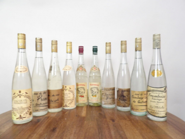 Eaux de vie : 10 bouteilles (70 cl) dont de la framboise, de la fraise, de la Mirabelle, de la prune ... Maisons Morand, Miclo, Patrice de Turckheim ..