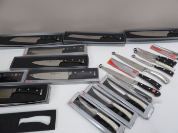 Coutellerie Wüsthof : 18 couteaux neufs, dont couteaux de chef, couteau à pain ... et 2 fourchettes à découper, neufs, fabrication allemande.