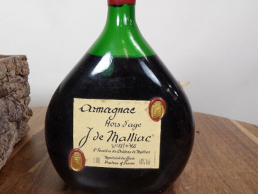 Armagnac hors d'âge J. De Malliac 1,5 L. bouteille numérotée 13 / 0765, flacon ciré boîte revêtement écorce, niveau bas