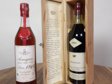 Armagnac 1948, 2 flacons de 70 cl : Castarède (cire manques, mise en bouteille en 1998) et Château de Laubade (cire et boîte en bois mise en bouteille en 1998)