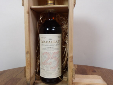 Scotch whisky The Macallan single malt 25 ans d'âge distillé en 1969 mise en bouteille en 1995, décollemets étiquettes, dans son coffret en bois (traces d'humidité, salissure)
