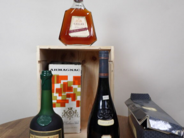 Gelas & Fils : 3 flacons de 70 cl dont un Bas Armagnac XO , (carafe scellée) un Vieil Armagnac 1949 (boîte carton abîmée,bouteille cirée) et un Bas Armagnac Napoléon boîte carton abîmée.