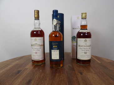 3 bouteilles de Scotch Whisky dont 2 The Macallan 12 ans d'âge ( 1L.) et une d'Oban Little Bay of Caves distillation 1982 (attention : étiquette décollée), niveaux bas.