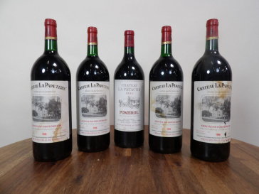 5 magnums de vin rouge dont 1 Pomerol Château La Patache 1995, 4 x Montagne-Saint-Emilion Château La Papeterie 1996, étiquettes tâchées.