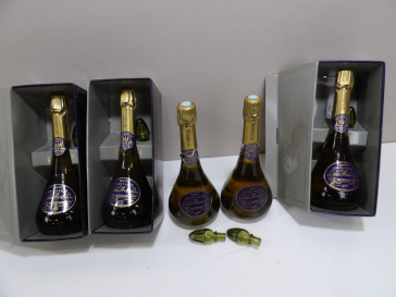 Champagne, 5 bouteilles formant carafes, Champagne des Princes millésimé Vintage 1982, maison De Venoge, 3 coffrets carton, état d'usage.