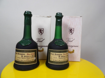 Vieil Armagnac 2 flacons maison Gelas & fils 1942 et 1962 flacons cirés avec manques de cire sur le 1942, voir dernières photos (boîtes carton abîmées).