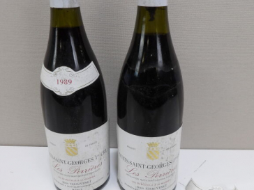 2 bouteilles de Nuits-Saint-Georges 1er Cru, Les Perrières par Jean Chauvenet 1989, décollement étiquettes, tâches.