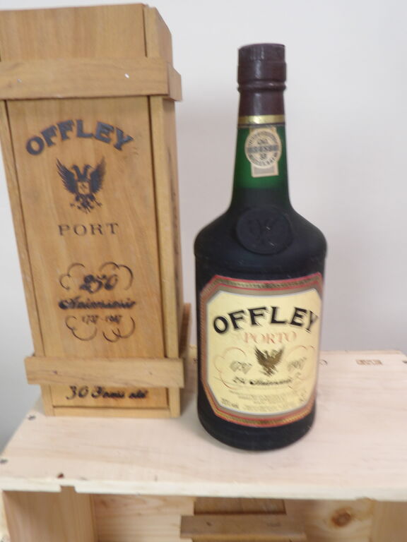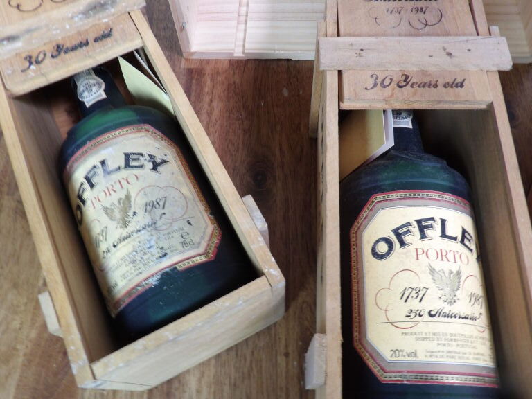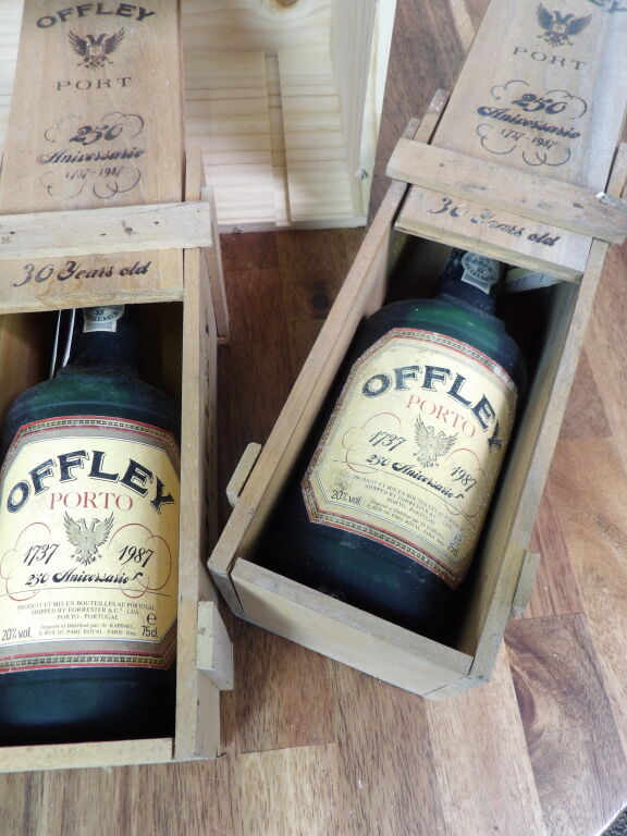4 bouteilles de Porto Offley, 250 ième anniversaire, 30 ans d'âge boîtes de bois certaines abîmées..