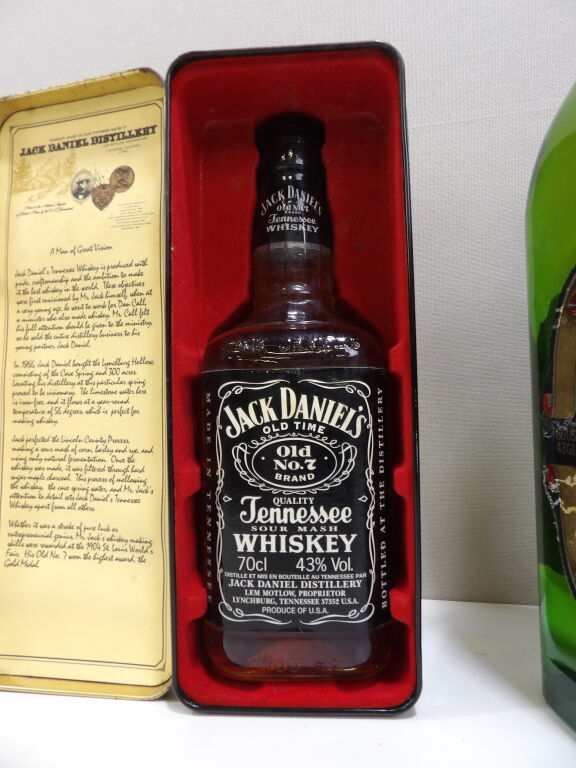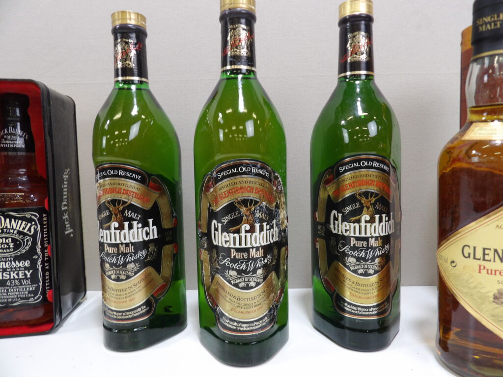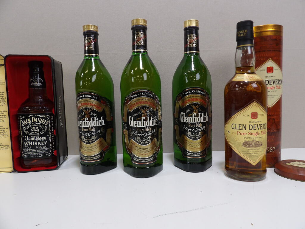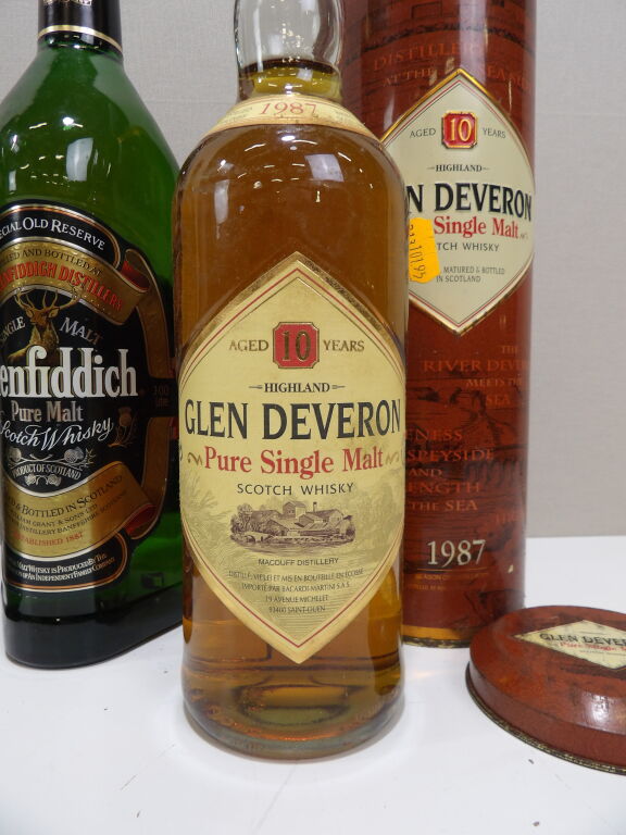 5 bouteilles dont 3 x Scotch Whisky Glenfiddich Special Old Reserve (1L.), Tennesse Jack Daniel's 70 cl, et Scotch Whisky Glen Deveron 10 ans d'âge (distillé en 1987)