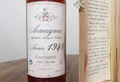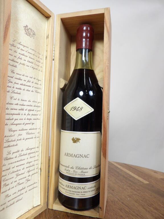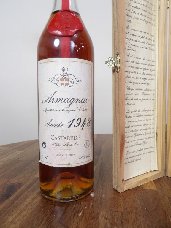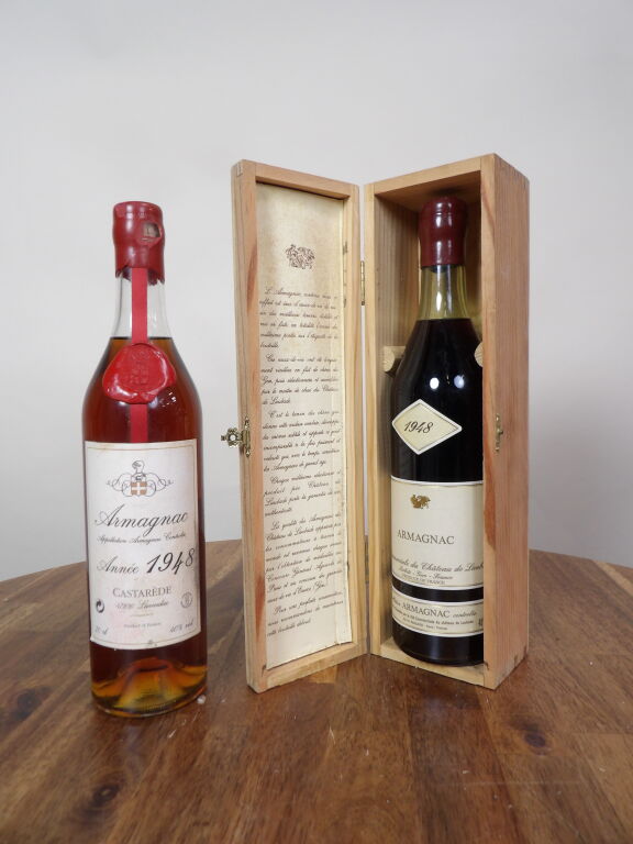 Armagnac 1948, 2 flacons de 70 cl : Castarède (cire manques, mise en bouteille en 1998) et Château de Laubade (cire et boîte en bois mise en bouteille en 1998)