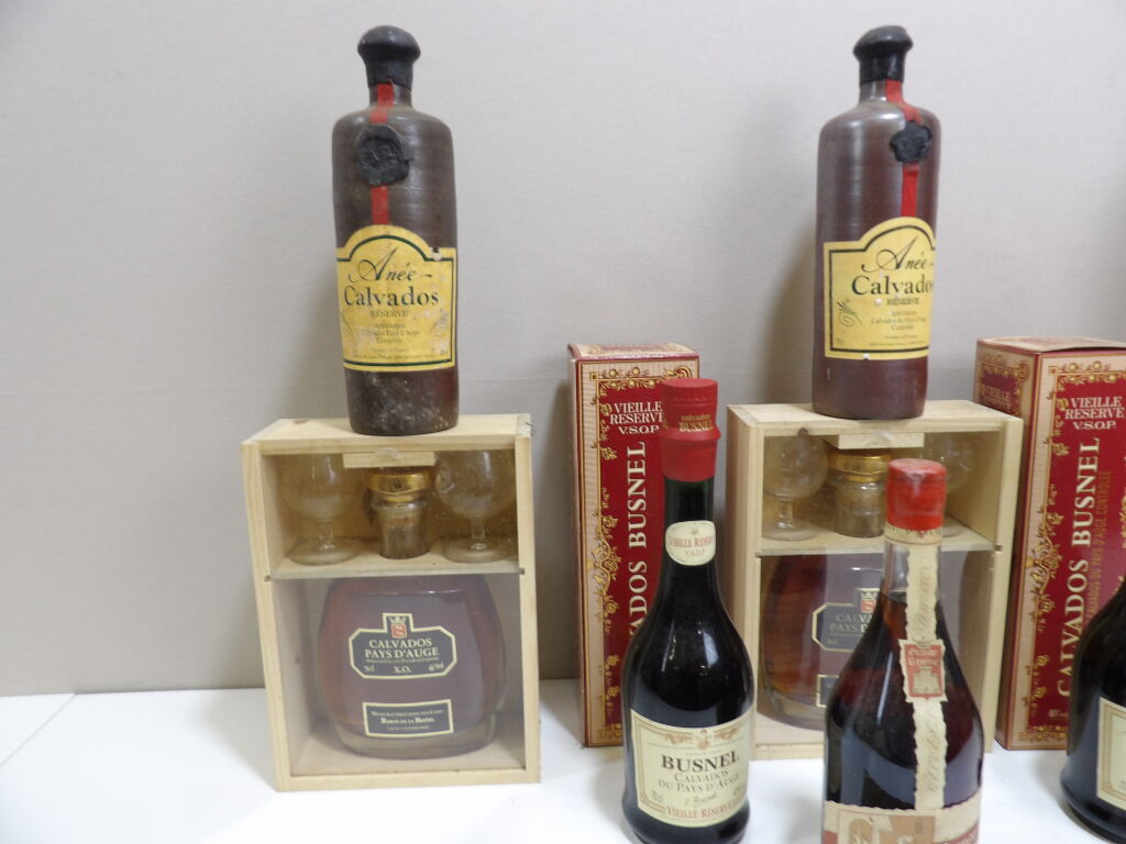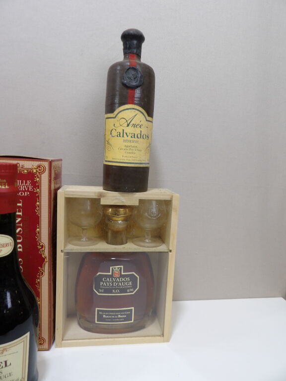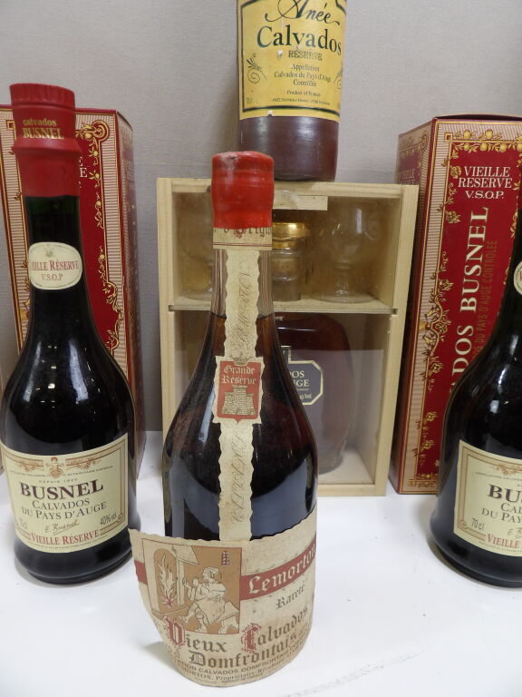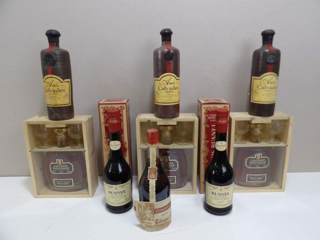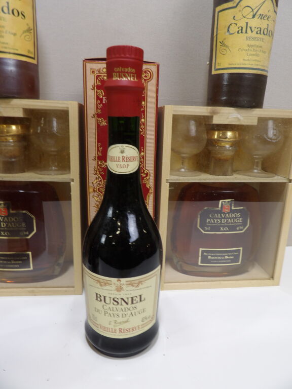 Calvados : 9 flacons de 70 cl, dont 3 coffrets ( 1 bouteille 70 cl et 2 verres) VSOP Baron de la Brière, 3x maison Anée Réserve, bouteille en grès, 2x Busnel VSOP vieille réserveet vieux Calvados Domfrontais Lemorton (étiquette décollée)