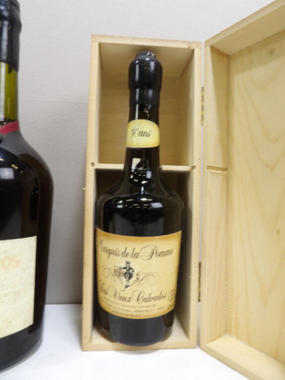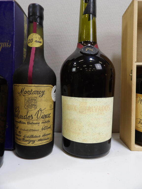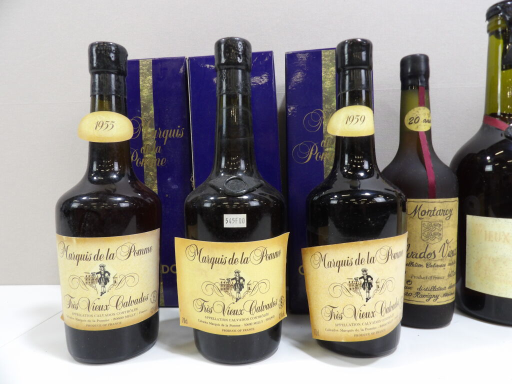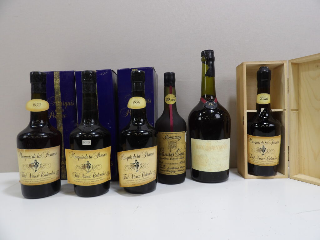 Calvados vieux et très vieux 6 flacons (5 x 70 cl et 1x 150 cl) maisons Marquis de la Pomme (1958, 1955 ...), Montarcy et Huet