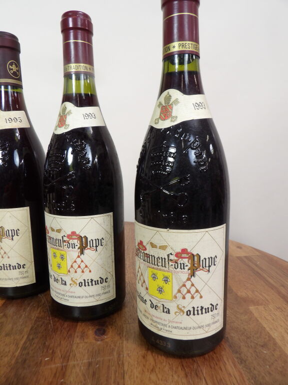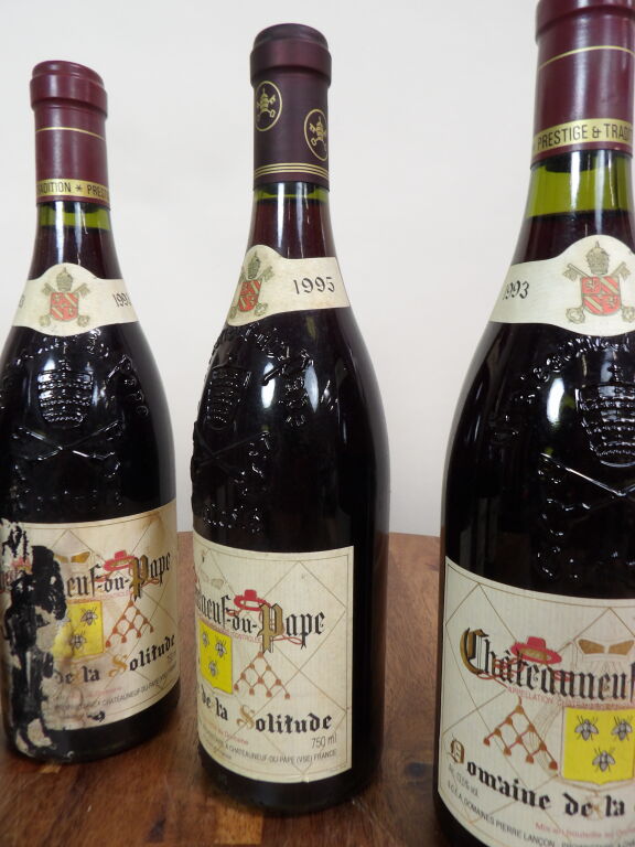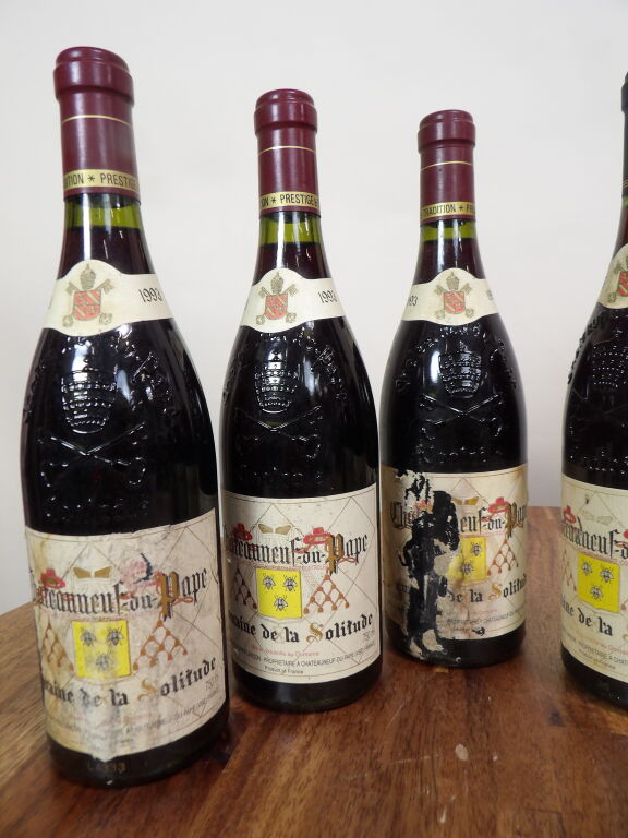 Châteauneuf-du-Pape, 6 bouteilles du Domaine de la Solitude 5 de 1993 et une de 1995 , niveaux voir photo, étiquettes endommagées.