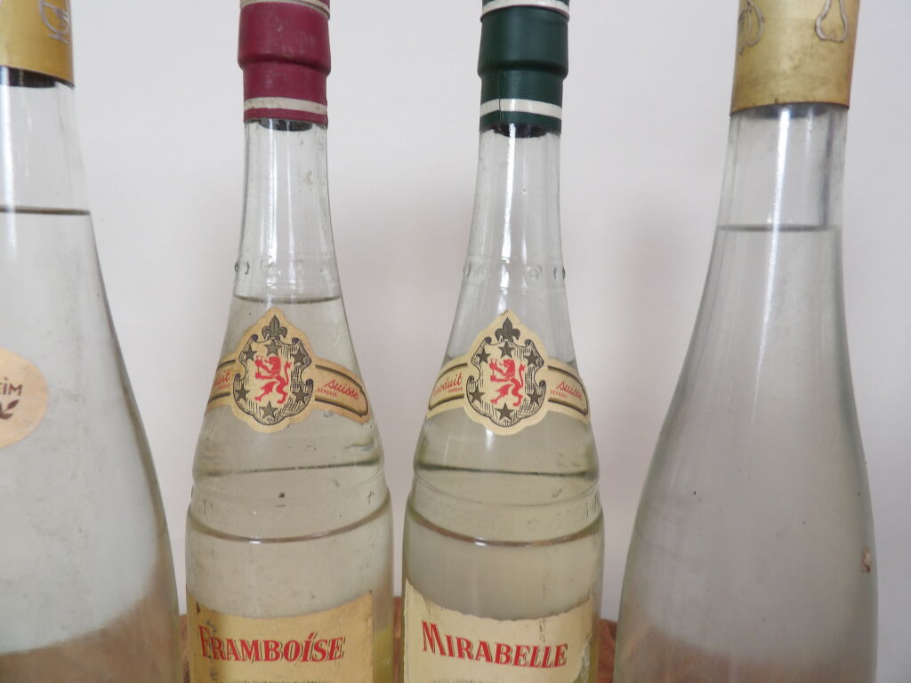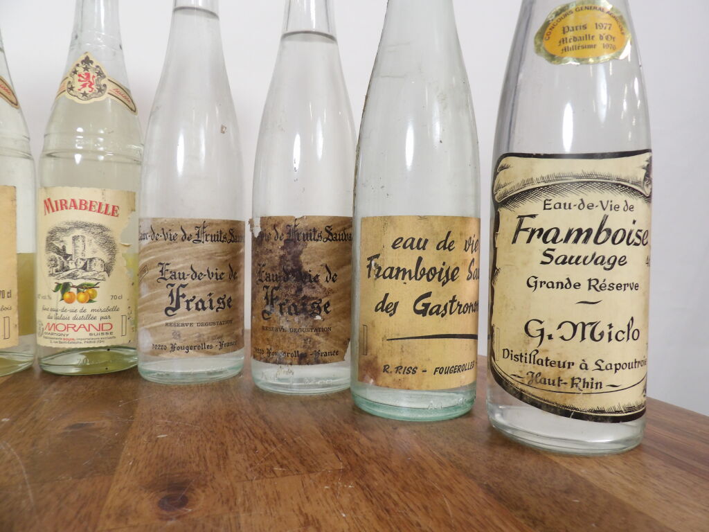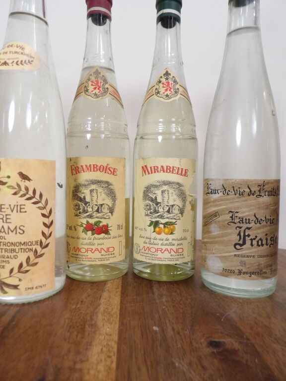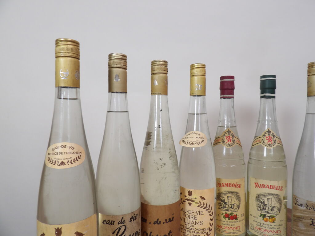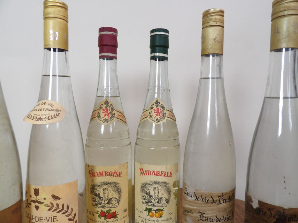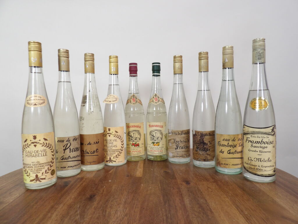 Eaux de vie : 10 bouteilles (70 cl) dont de la framboise, de la fraise, de la Mirabelle, de la prune ... Maisons Morand, Miclo, Patrice de Turckheim ..