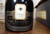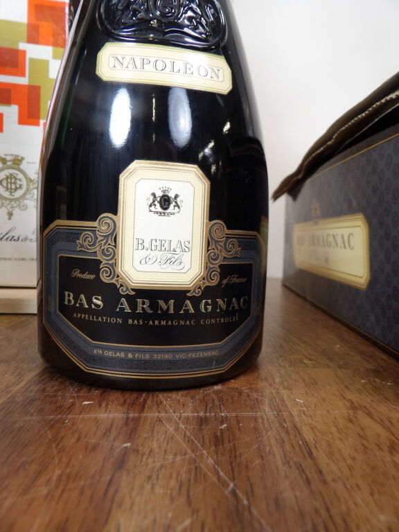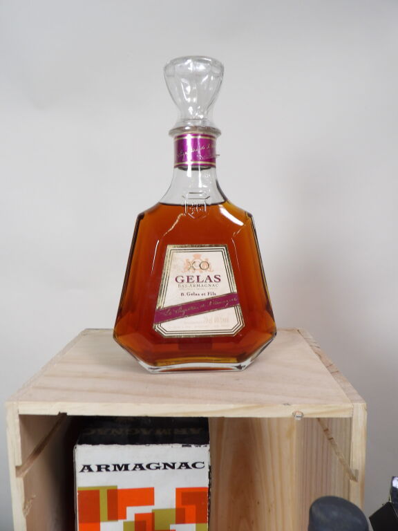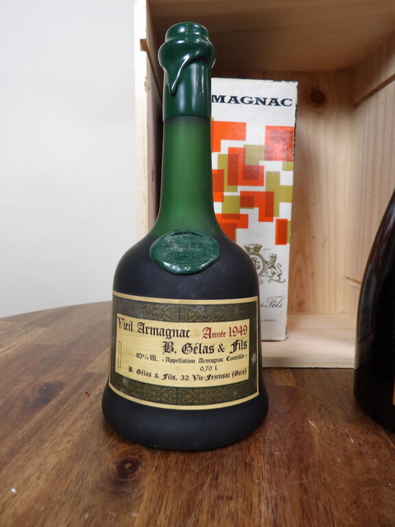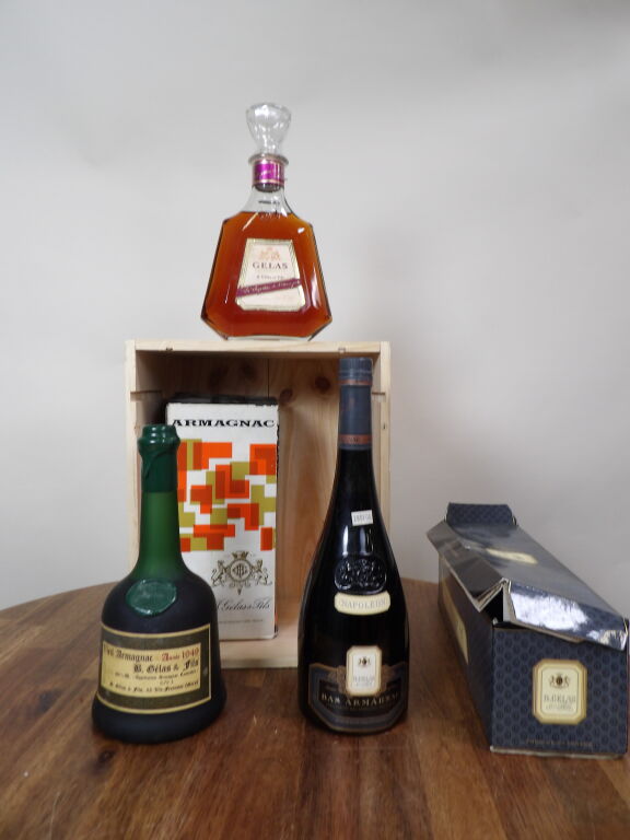 Gelas & Fils : 3 flacons de 70 cl dont un Bas Armagnac XO , (carafe scellée) un Vieil Armagnac 1949 (boîte carton abîmée,bouteille cirée) et un Bas Armagnac Napoléon boîte carton abîmée.