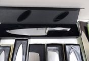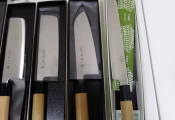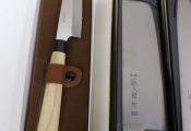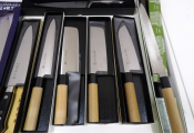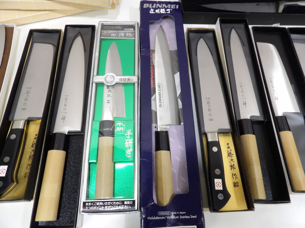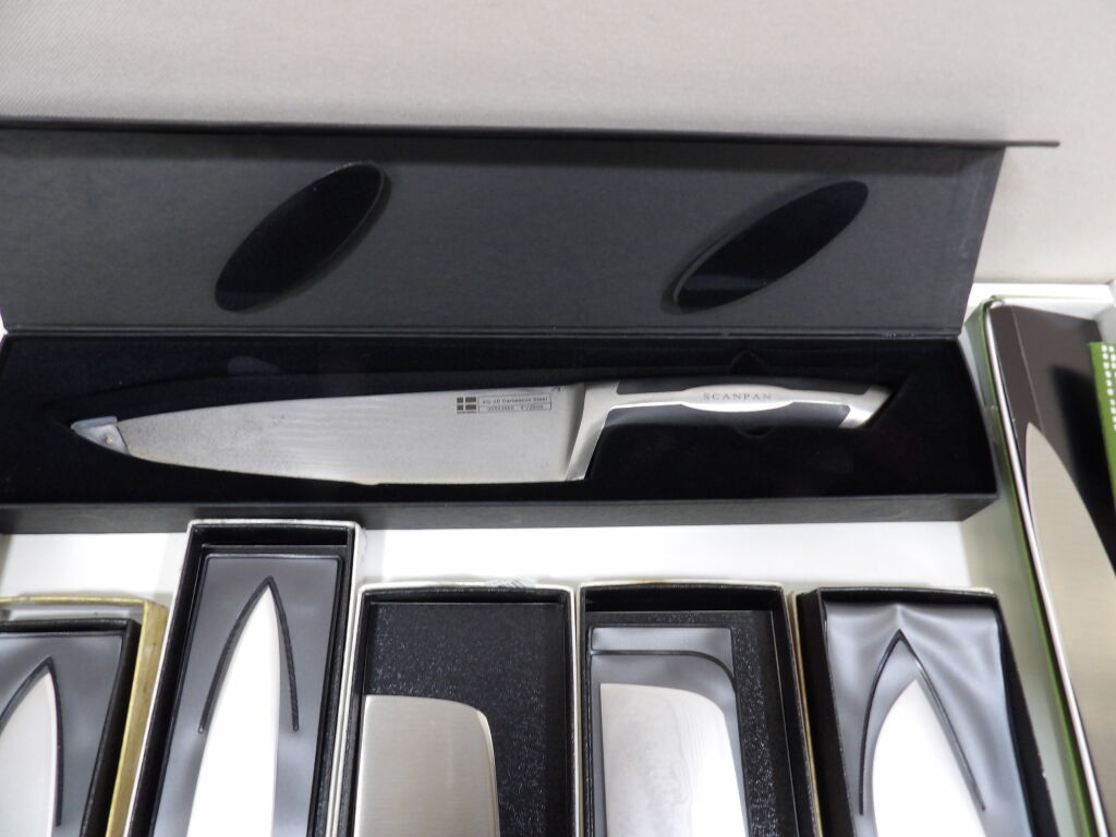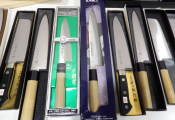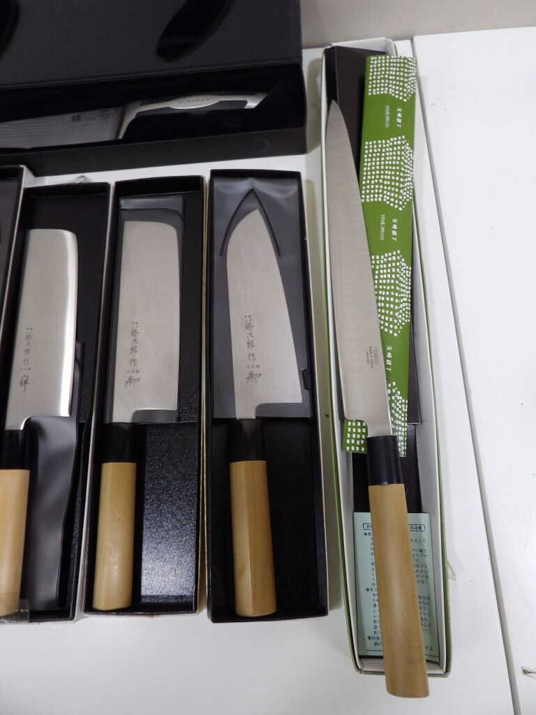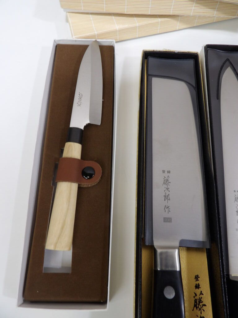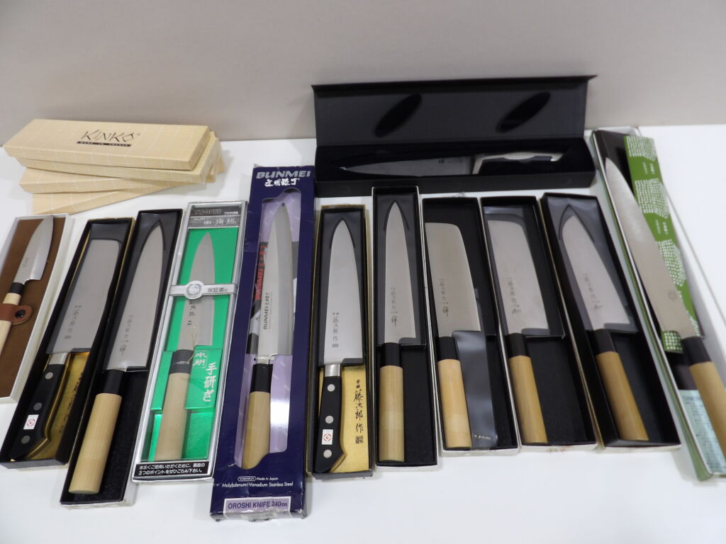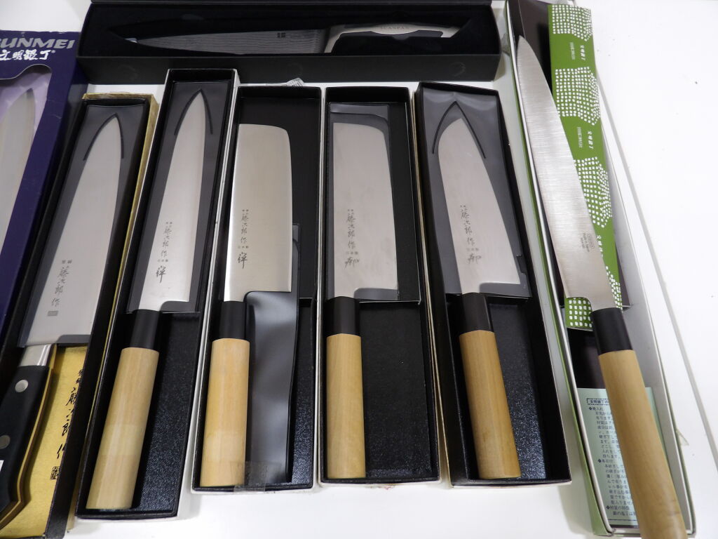Quinzaine de couteaux principalement japonais et couteau de chef, jamais servis dont 2 couteaux pleine soie (boîtes abîmées).