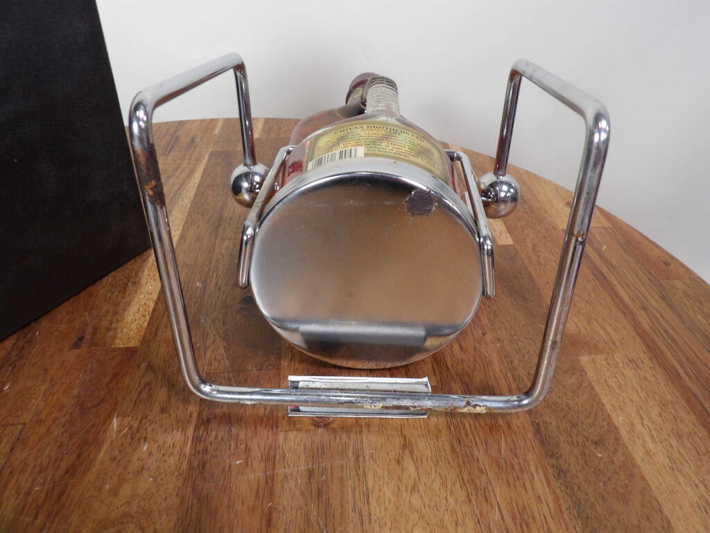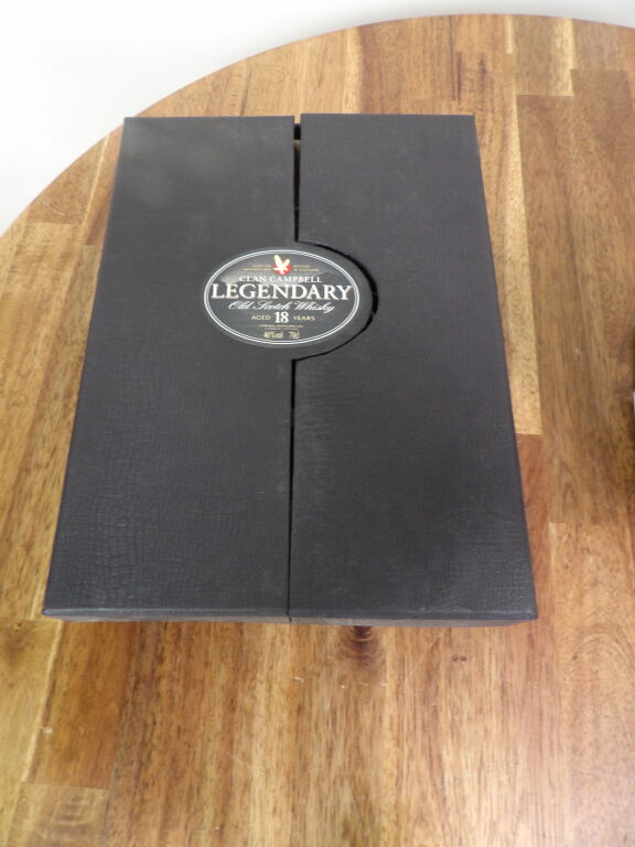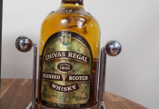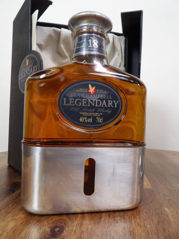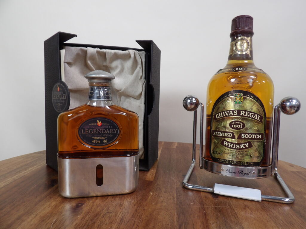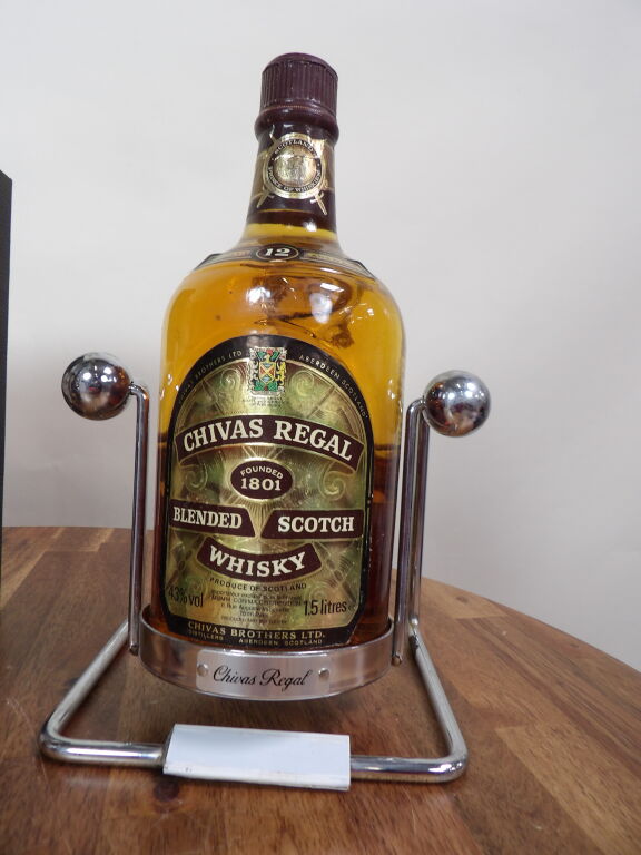 Scotch Whisky : magnum de Chivas Regal sur son socle à balancier en métal chromé (piqures) on y joint une bouteille de Clan Campbell (70 cl) legendary 18 ans d'âge coffret carton abîmé.