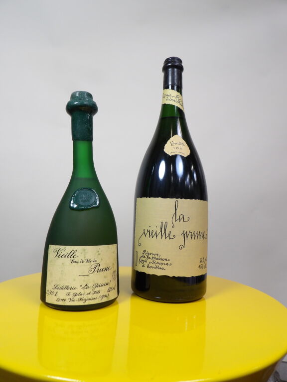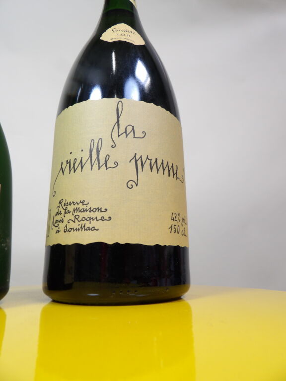 Vieille prune de Souillac maison Louis Roque un magnum et une bouteille de 70 cl de vieille eau de vie de prune Gelas & fils