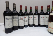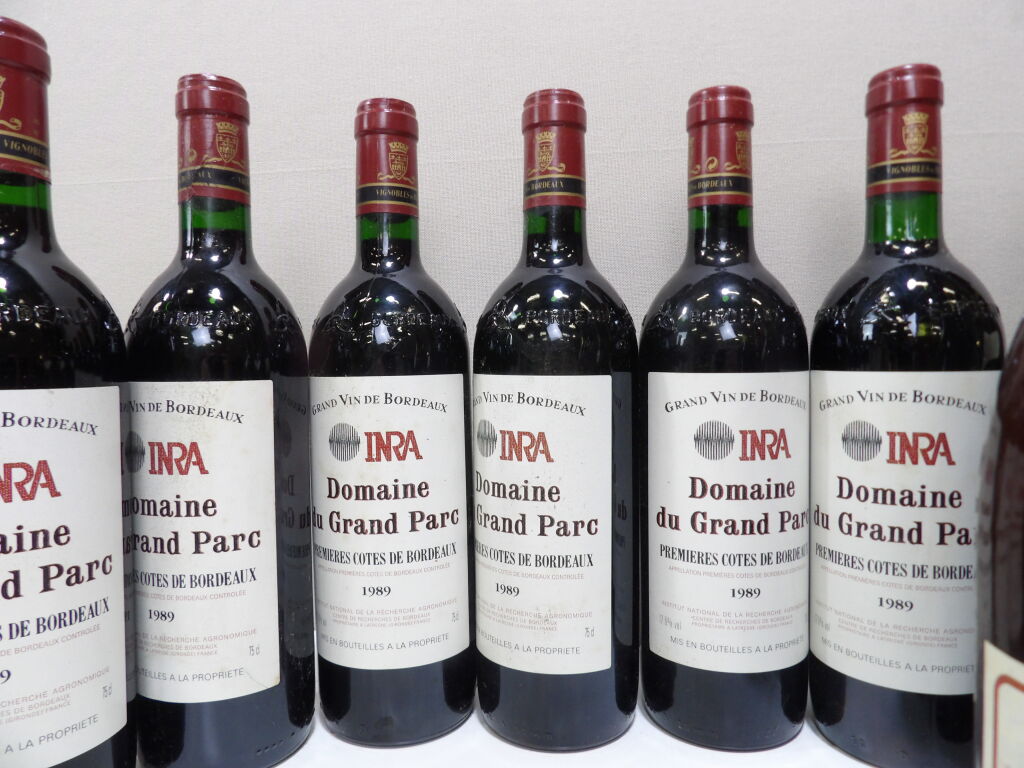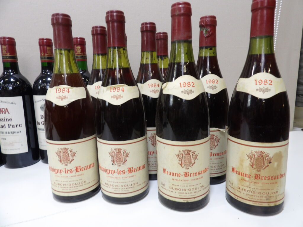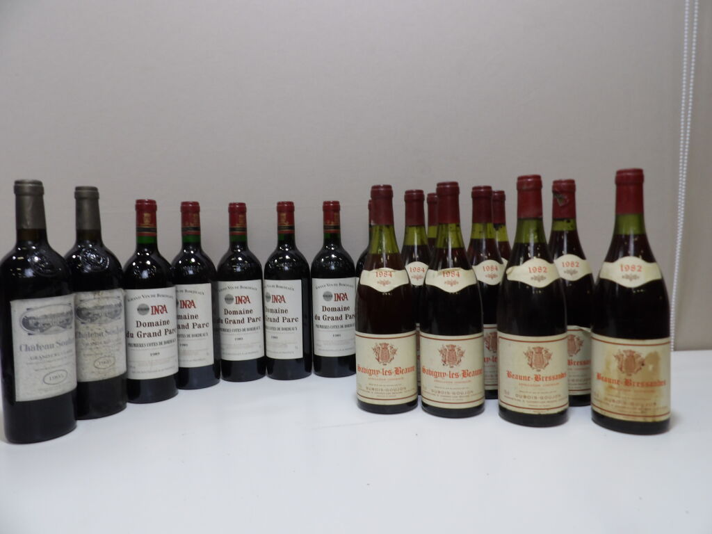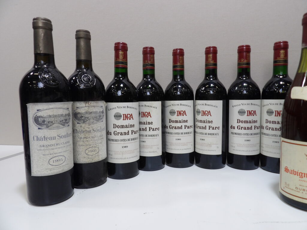 Vins rouges régions de Bordeaux et Bourgogne : fond de cave composé de 17 bouteilles dont 6 bouteilles de premières Côtes de Bordeaux Domaine du Grand Parc 1989, 2 bouteilles de Saint-Emilion Grand Cru Chateaiu Soulard 1995 (étiquettes piquées) , 8 bouteilles de Savigny-Les-Beaune maison Dubois-Goujon (forts dépôts) 6 x 1984 et 3 x 1982, divers niveaux ...