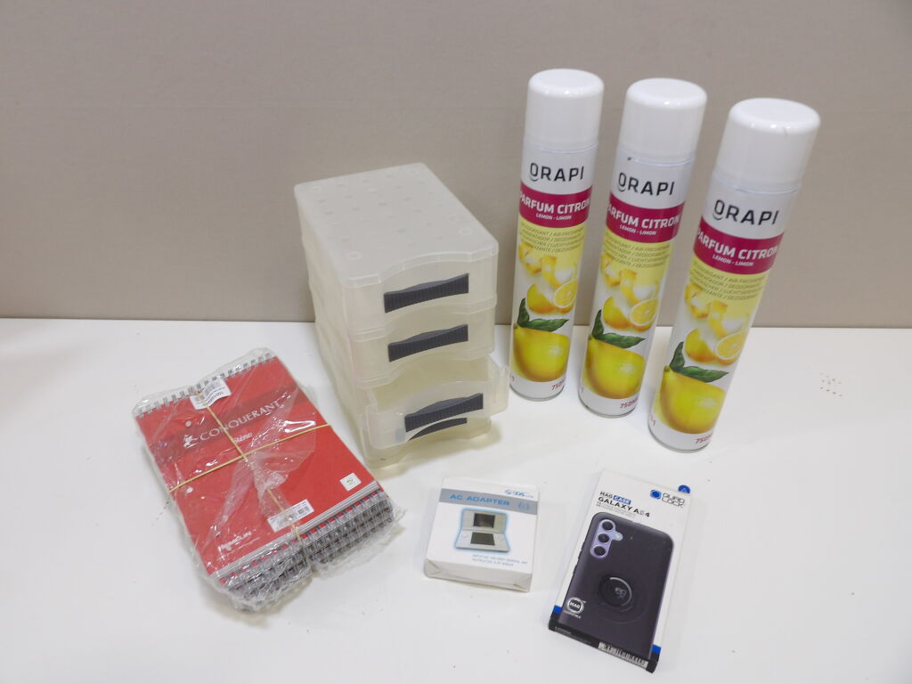 BUREAUTIQUE - 1 Lot d'articles variés dont 7 Blocs notes à spirale + 3 Bombes désodorisante citron + 1 Chargeur + 1 Petite colonne en plastique de 4 tiroirs + 1 Coque de téléphoine Magnétique pour GALAXY A54
