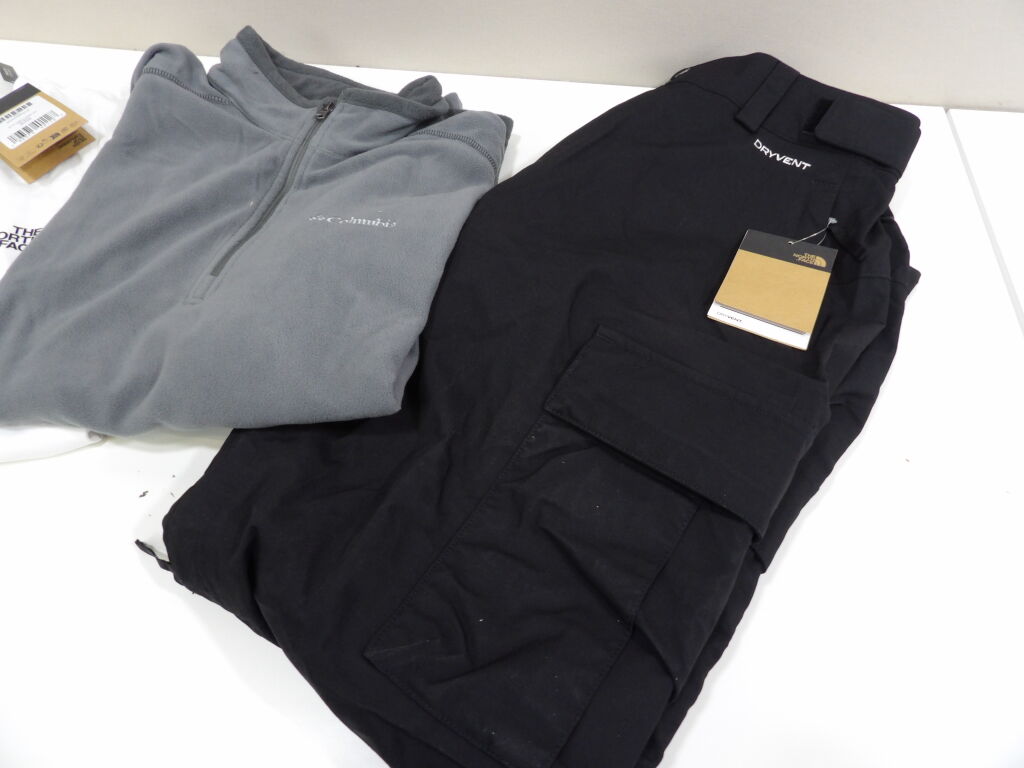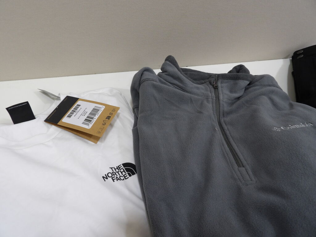 COLUMBIA, THE NORTH FACE et PUMA : Lot de x4 articles neufs : Tshirt et Pantalon the North Face en taille M, Polaire Columbia en M et Chaussures PUMA en 41 (état neuf).