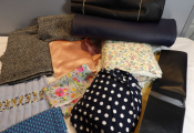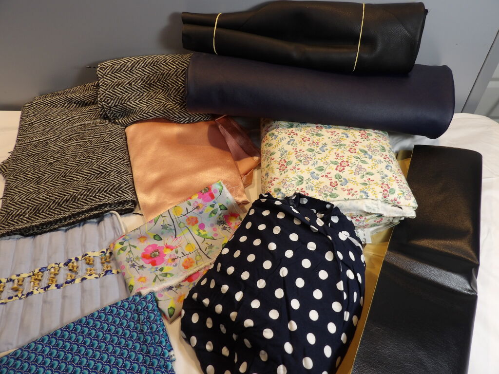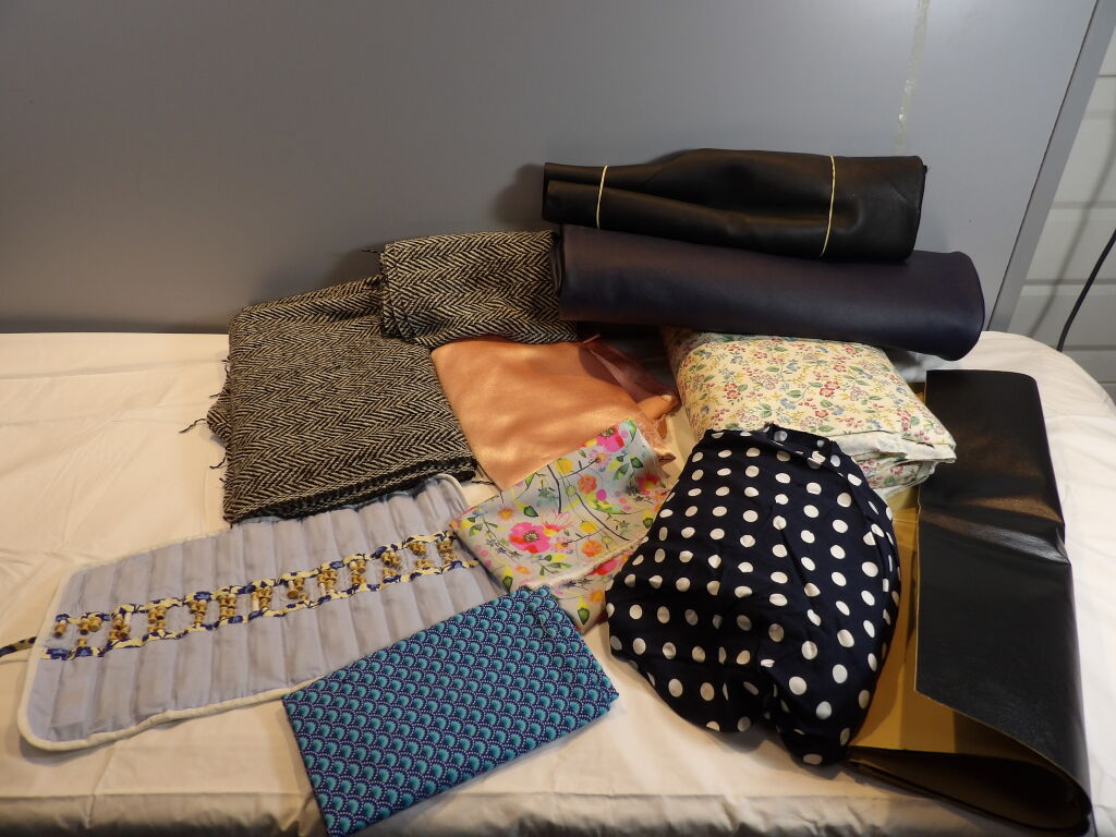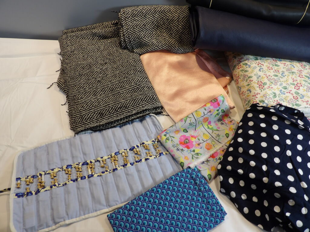 COUTURE :10 coupon de tissus et autres matiere - 1 lot de mercerie 47 fusettes Neuf et occasion
