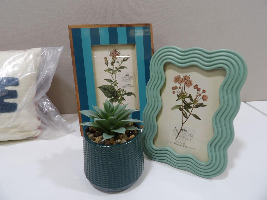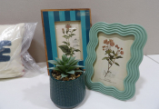 DECORATION : x2 cadres, x1 fausse plante et x1 coussin. On y ajoute x6 bouteilles pour y glisser des fleurs séchées ou autre selon votre goût ! Tout est neuf