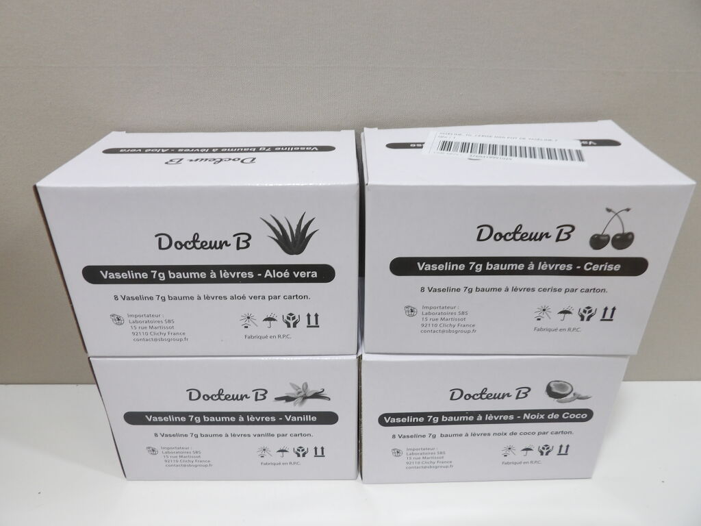 DOCTEUR B - Lot de 32 baumes à lèvres 7gr - différents parfums: Aloé vera - Vanille - Noix de coco et cerise