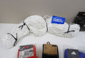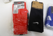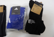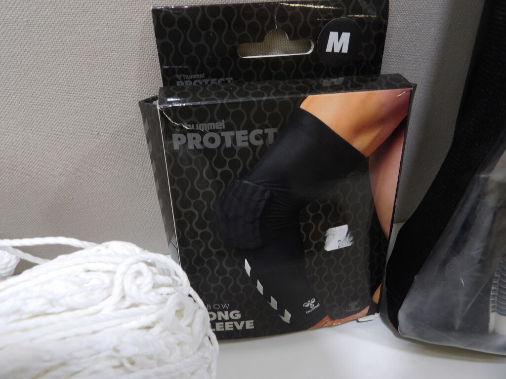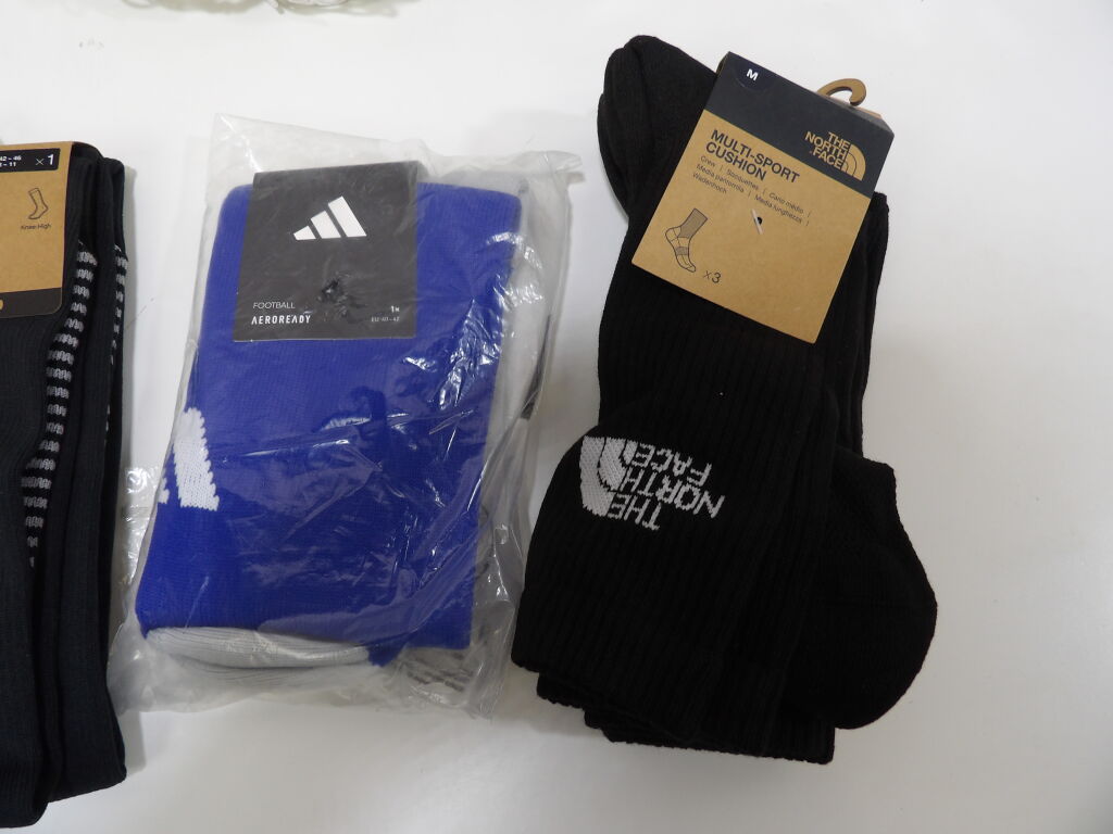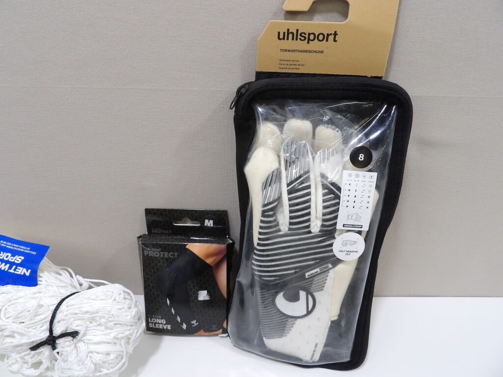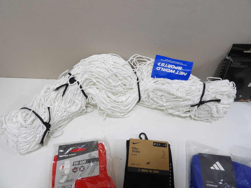 FOOTBALL - Lot de x7 articles neufs : Filet pour but, Gants uhlsport en T8, Hummel protection coude M, x3 paires de chaussettes de football (Nike, Decathlon et Adidas); et x1 pack de 3 paires de chaussettes multi sports THE NORTH FACE.