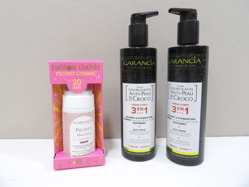 GARANCIA Lot de x3 articles neufs : Edition Limitée PSCHITT COSMIC Micropeeling sans grain à acation biologique visage, et x2 Crèmes corps Formule ensorcelante Anti-peau de Croco 3 en 1 - de 400ML.