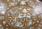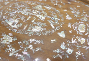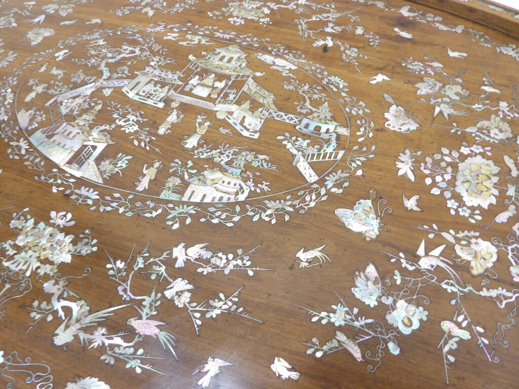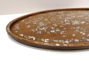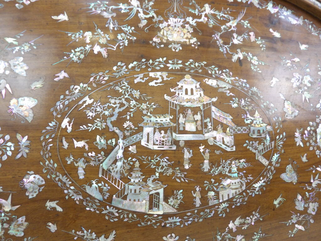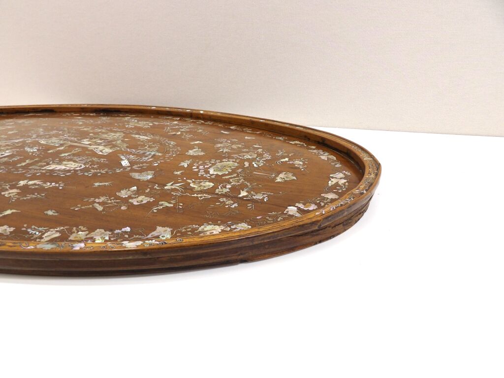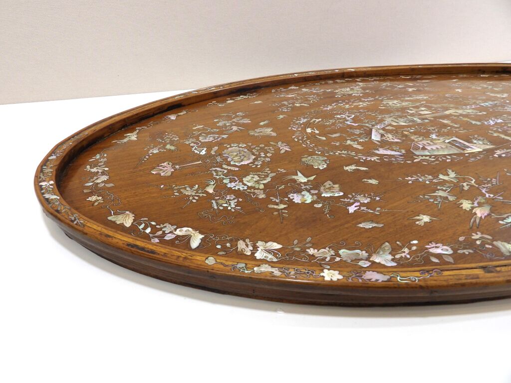 Grand plateau asiatique ovale en bois à incrustations de nacre, décor de pagode, fleurs, oiseaux et papillons (76 x 47 cm)