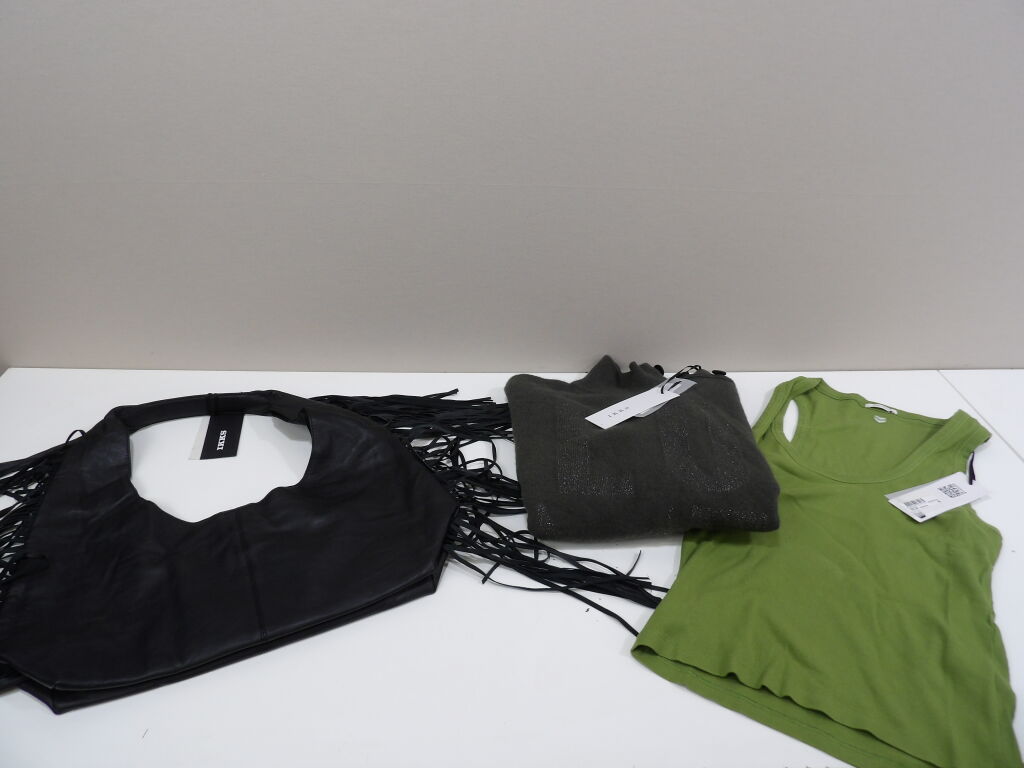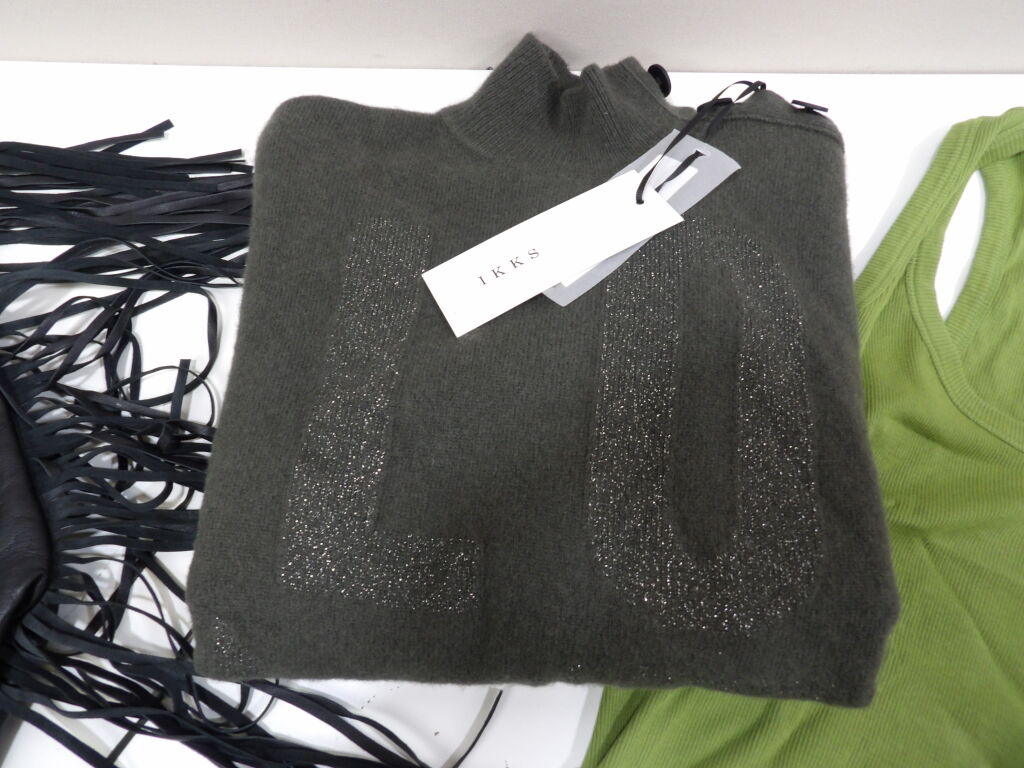 IKKS - 2 vêtements FEMME en taille S - NEUFS : Un débardeur et un pull. On y inclut un sac noir à franges, NEUF.