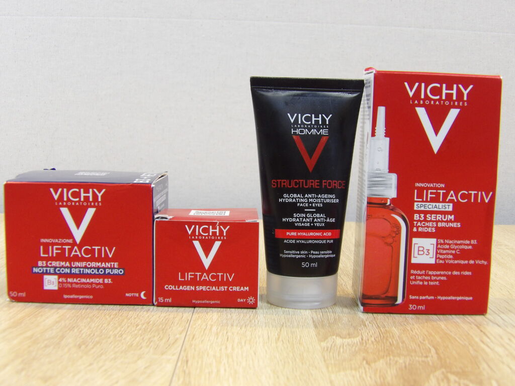 Laboratoire VICHY / DERCOS Technique : Lot de 4 articles pour le visage : 1 Crème B3 unifiante 50ml + 1 Crème collagen spécialiste 15ml + 1 Soin hydratant anti-âge 50ml + 1 Sérum B3 spécialiste 30ml. *NEUF*