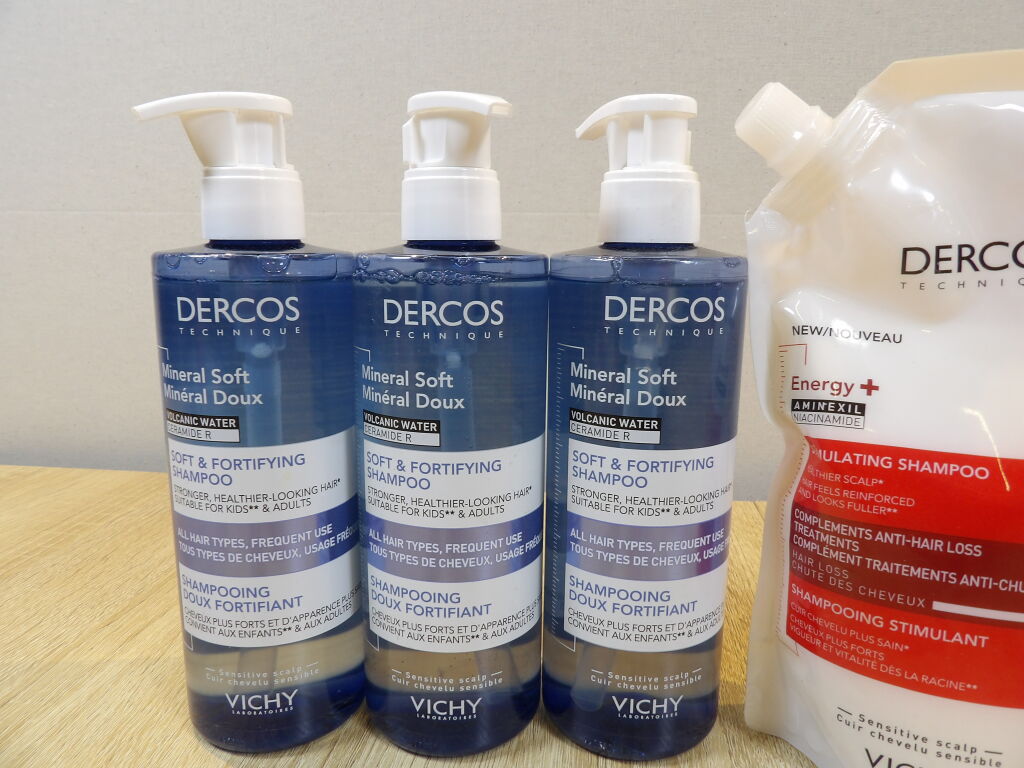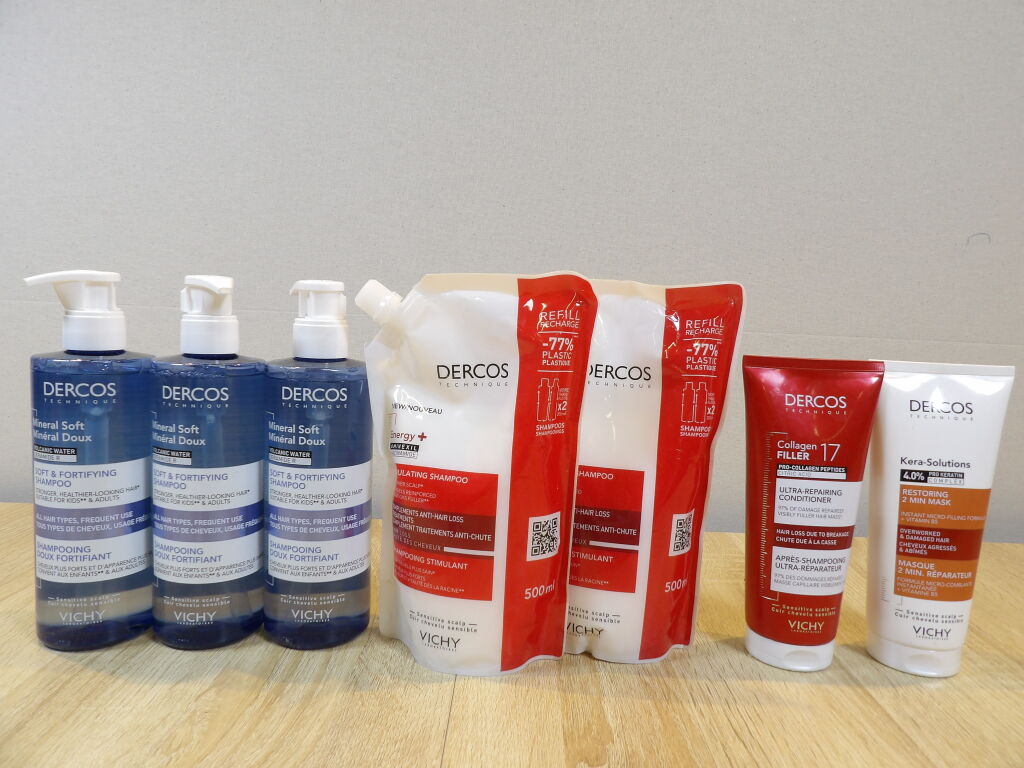 Laboratoire VICHY / DERCOS Technique : Lot de 7 articles dont : 3 Shampooing doux fortifiant 400ml + 2 Shampooing stimulant anti-chute de cheveux 500ml + 1 après-shampooing ultra-réparateur 200ml + 1 masque réparateur 200ml *NEUF*