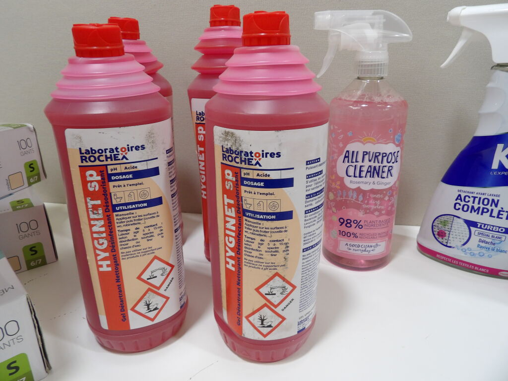 Lot de PRODUITS MENAGERS : x2 Pulvérisateurs Kr - Détachant avant lavage; x1 Nettoyant tout usage, x4 Gel Détartrant Nettoyant Désinfectant Désodorisant, et des gants en latex (pour bien se protéger pour faire le ménage?)