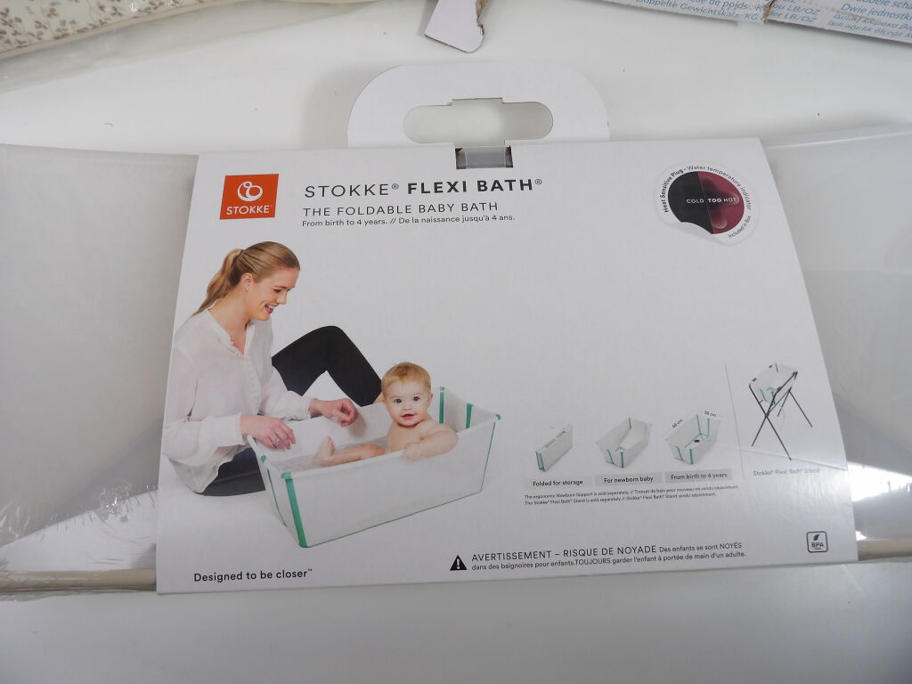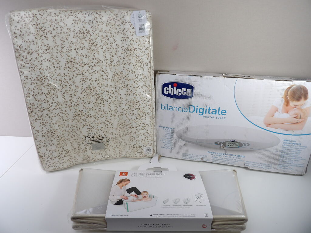 Lot de x3 articles neufs (et un d'occasion Chicco balance - non testée) : Ainsi qu'un matelas neuf à langer fleuri CAM CAM et une baignoire pliable STOKKE Flexi Bath (de la naissance jusqu'à 4 ans) Neuve.