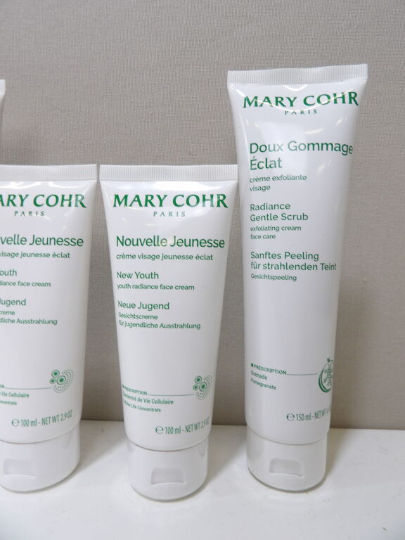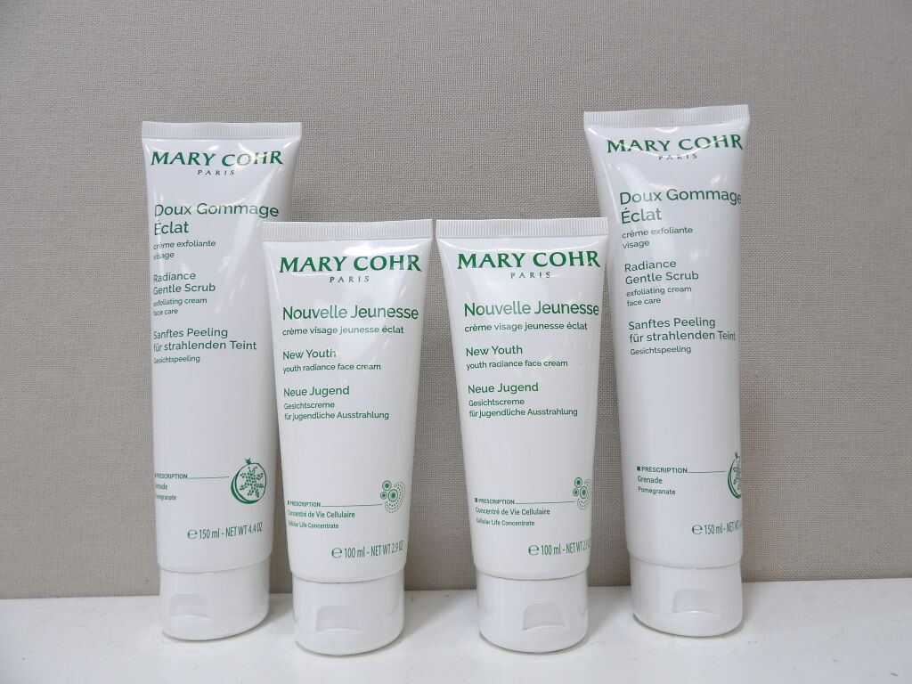 Mary Cohr, 4 tubes dont 2 de crème visage jeunesse 100 ml, 2 de Gommage doux éclat 150 ml, cosmétiques professionnels