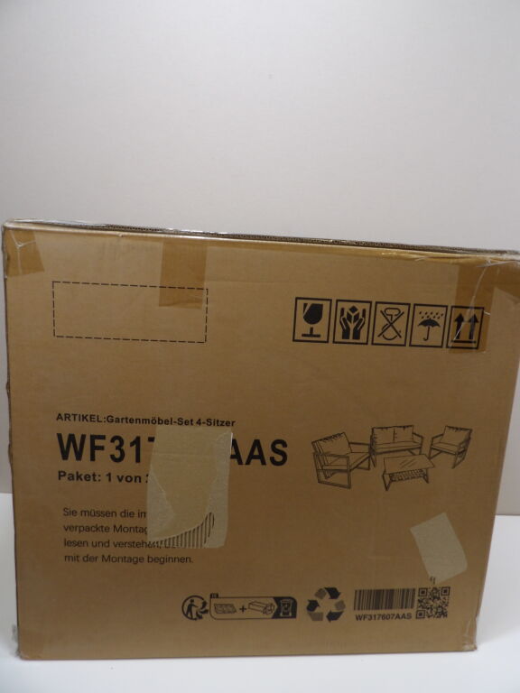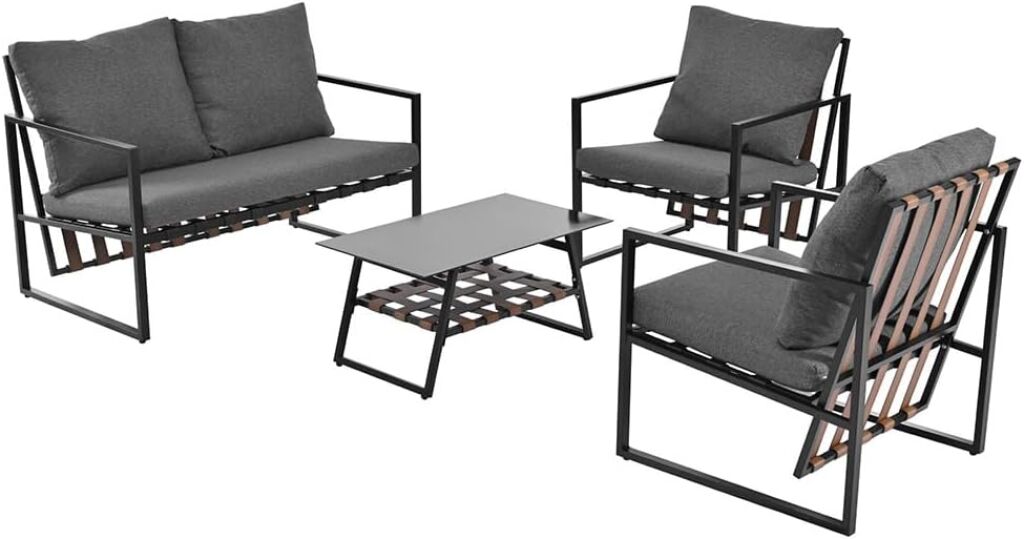 NEUF - Salon de Jardin pour 4 Personnes, avec canapé, Table Basse et Coussins. La première image est de synthèse.