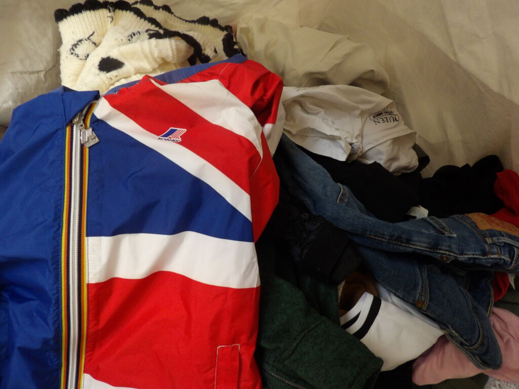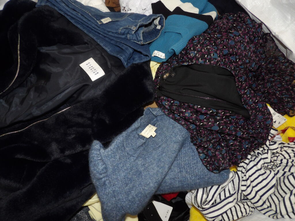 Palette de 200 pièces de vêtements d'occasion et certains neufs : Femme, Enfant, Homme ( divers gammes et marques dont Claudie Pierlot - Maje -La Maille Sézane ...) - ATTENTION ce lot est d'occasion tous états et contient divers gammes donc de l'entrée type KIABI aussi. il n'est pas composé uniquement des marques citées.