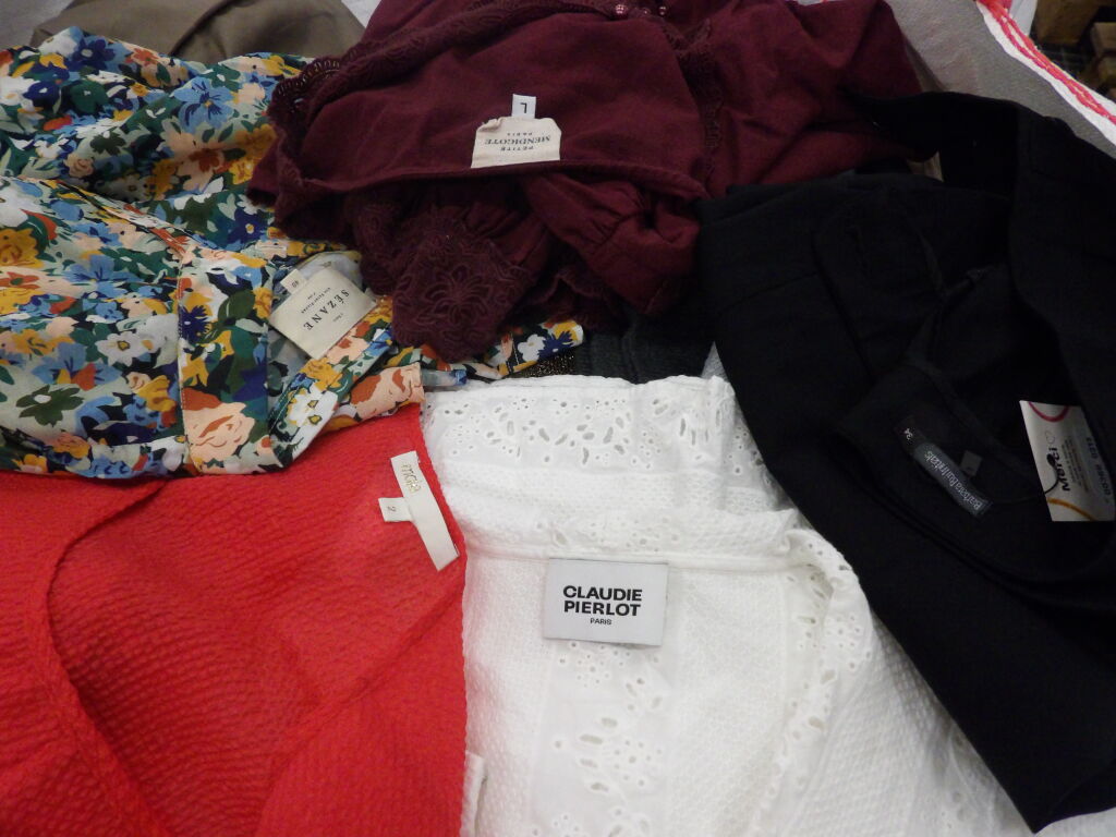 Palette de 200 pièces de vêtements d'occasion et certains neufs : Femme, Enfant, Homme ( divers gammes et marques dont Claudie Pierlot - Maje - Sézane ...) - ATTENTION ce lot est d'occasion tous états et contient divers gammes donc de l'entrée type KIABI aussi. il n'est pas composé uniquement des marques citées.