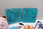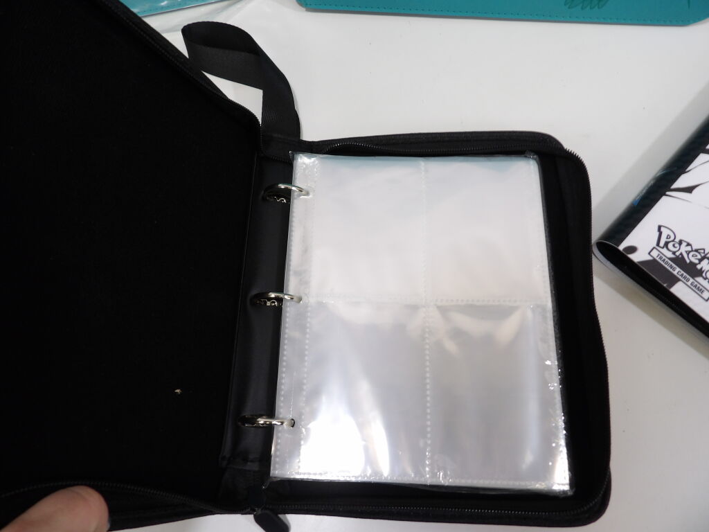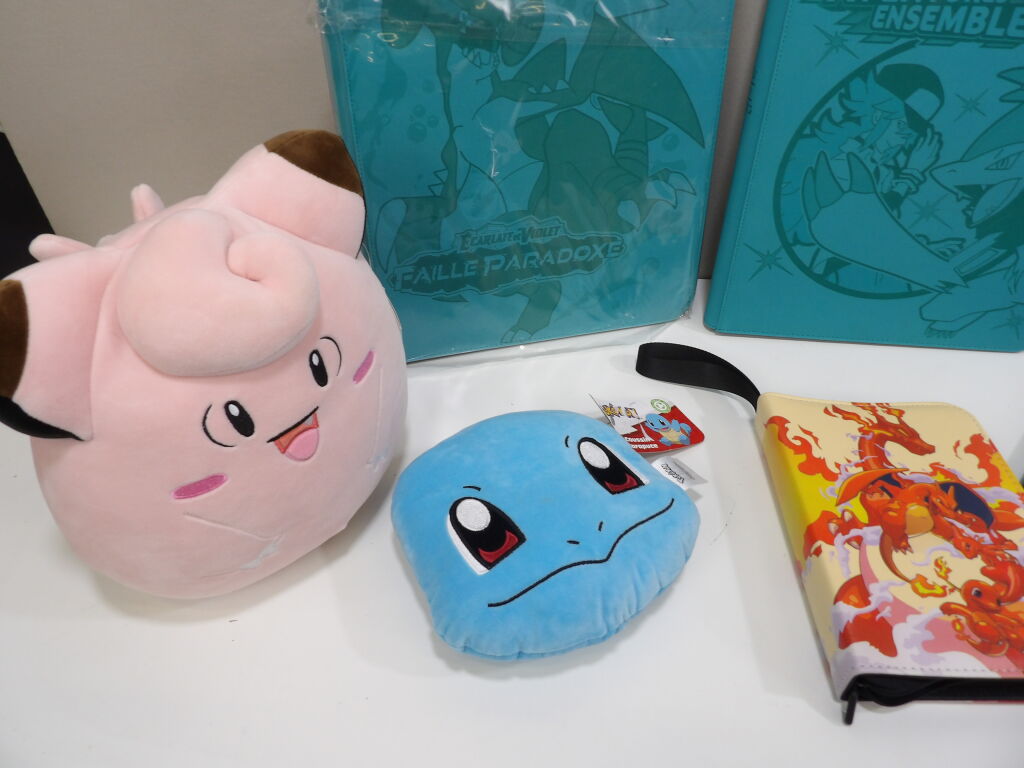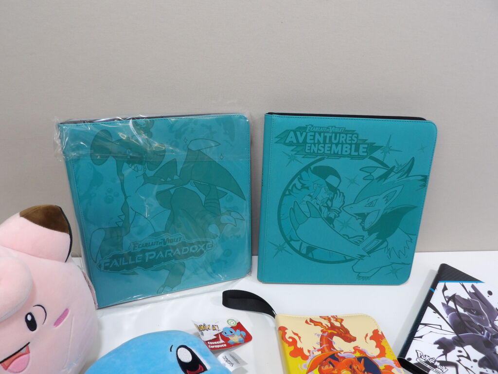 POKEMON : Lot de x5 classeurs avec intercalaires pour y glisser les cartes, principalement NEUFS. On y inclut x2 peluches neuves.
