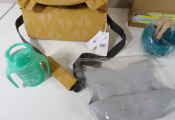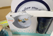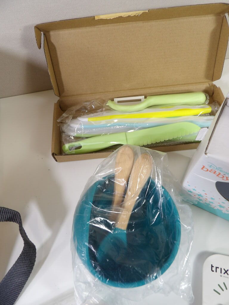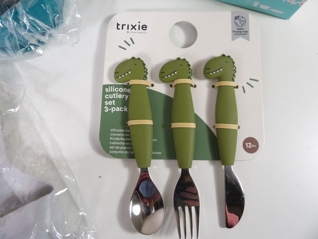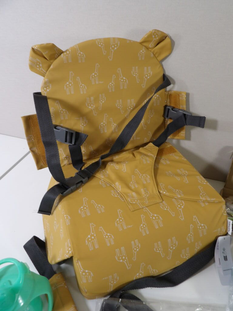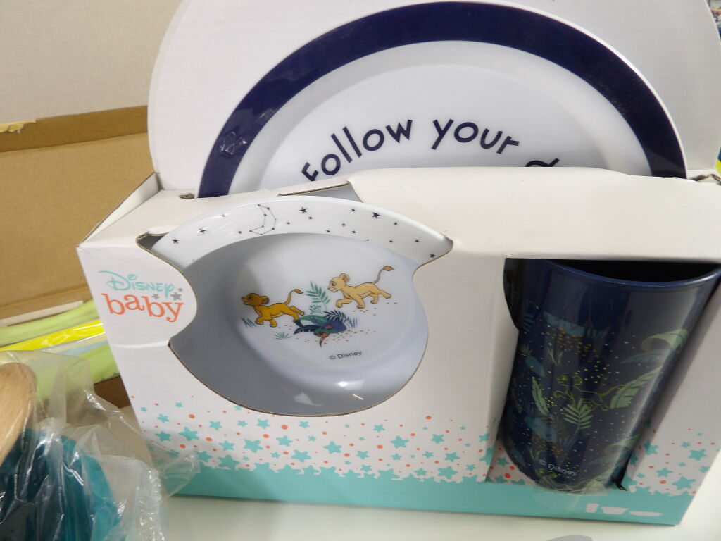 REPAS pour bébé / enfant : lot de x7 articles neufs : Disney Baby le roi lion assiette, verre..., gourde Twistshake, couverts dont TRIXIE, et bavoir en silicone. On y inclut un réhausseur chaise déperlant, ocre avec petits girafes NOUKIE'S - neuf !