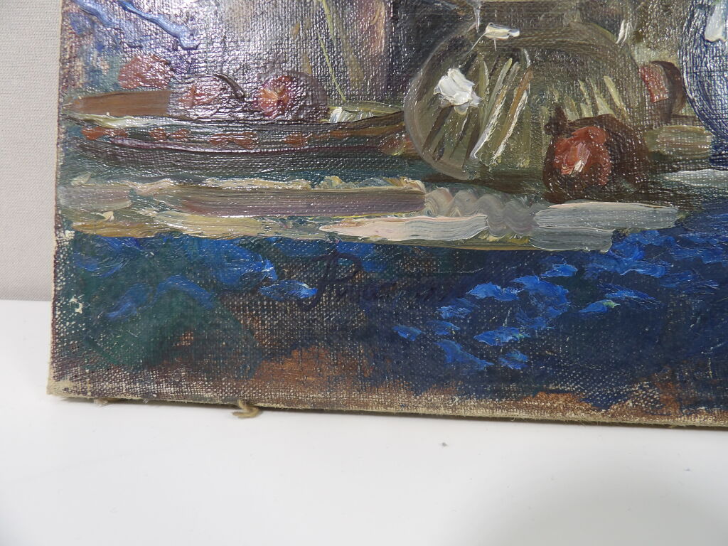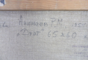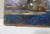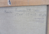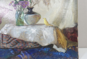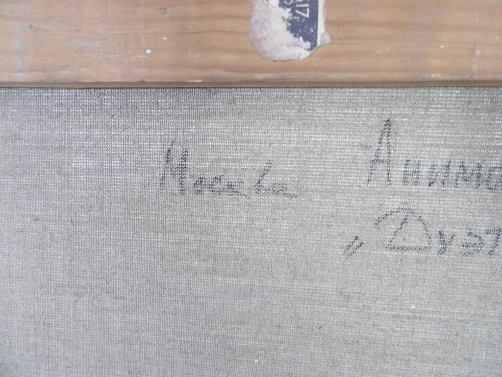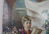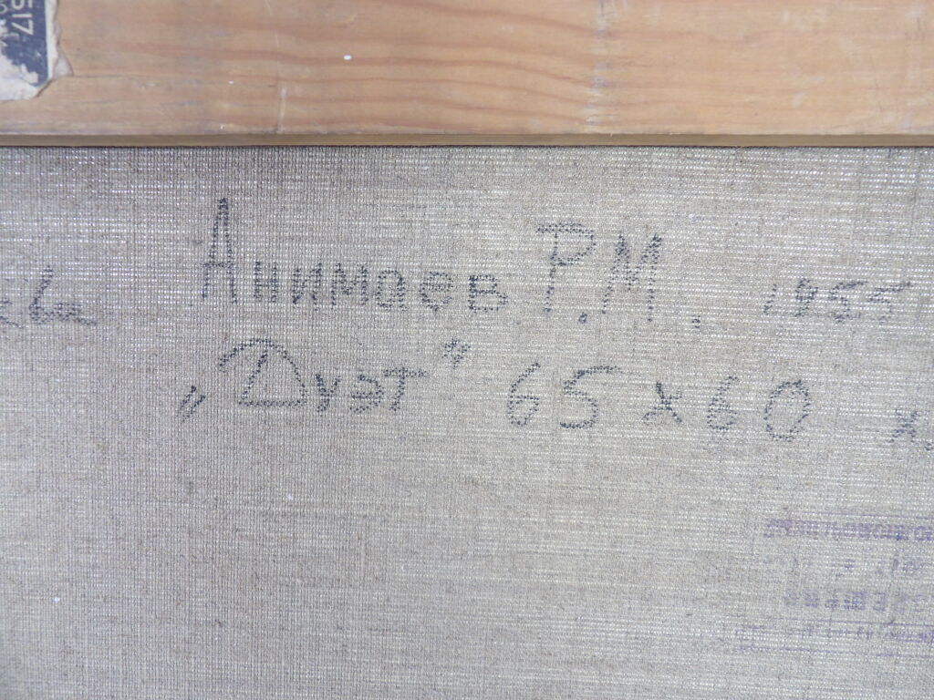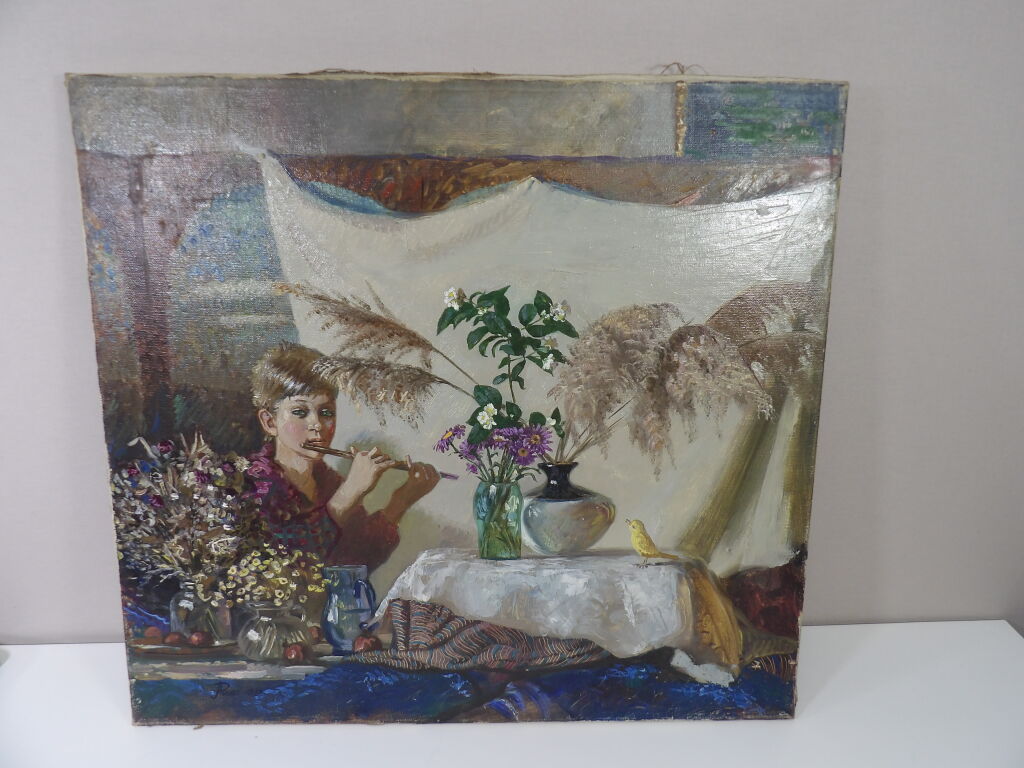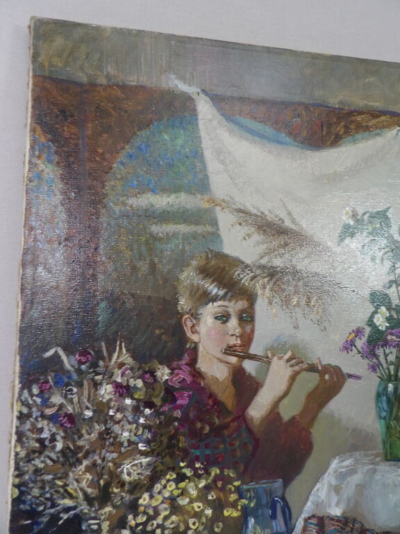 Rinat Animaev (1955 Tadjikistan) peintre de l'école russe XXe arrivé en France en 1989, installé à Dinan. Huile sur toile "Duo" enfant à la flûte et canari (peint à Moscou) 65x60 cm, signé en bas à droite