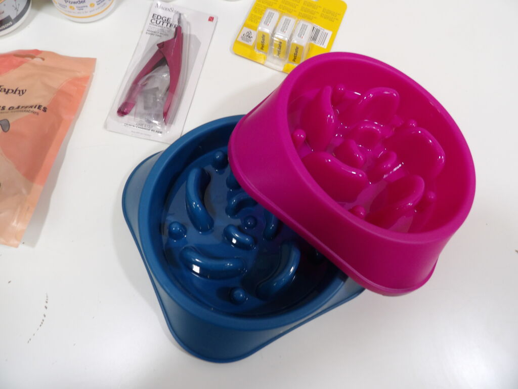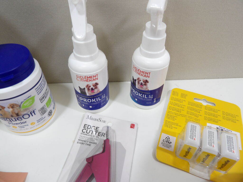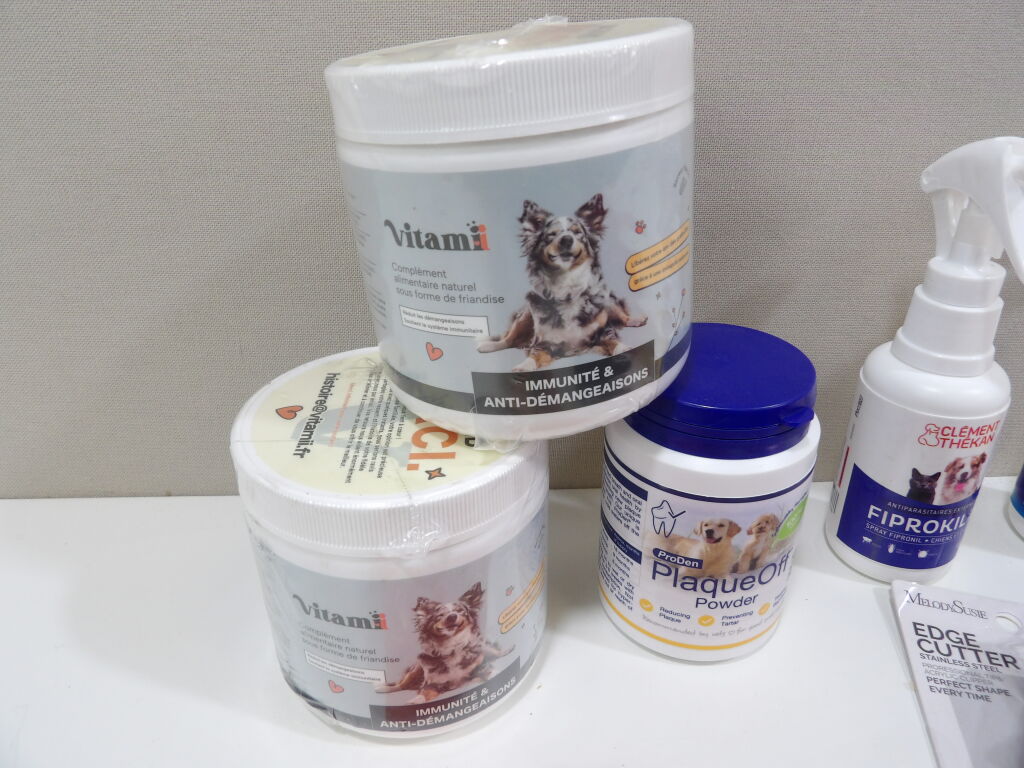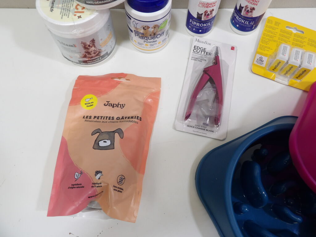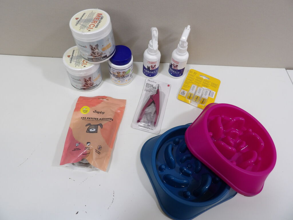 SOINS POUR CHIENS : Lot de x8 articles neufs et occasion : gamelles anti glouton, compléments alimentaires Vitamii Immunité & anti-démangeaisons, antiparasitaires ....
