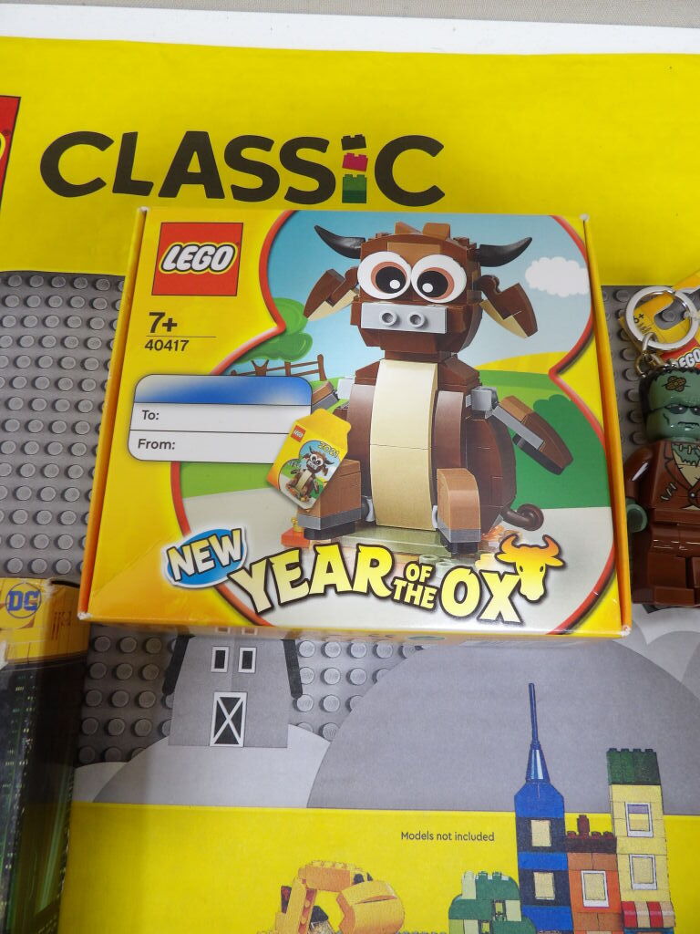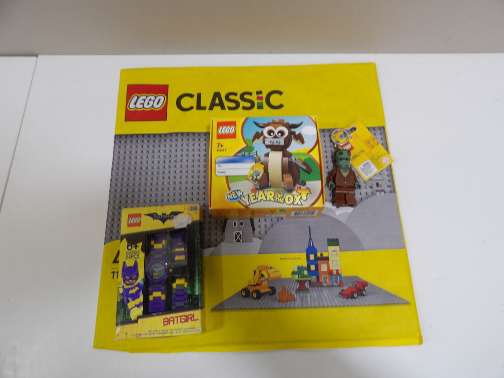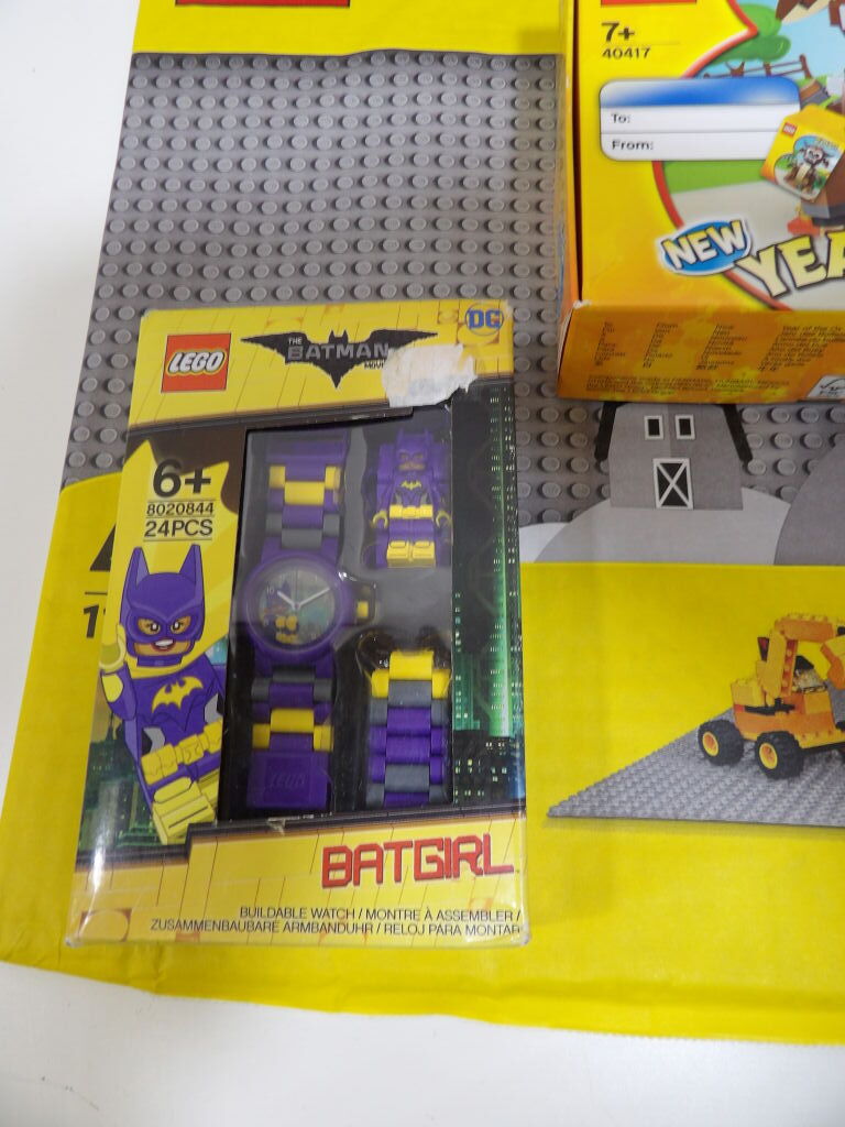 Univers Légo : une montre enfant Batgirl, un porte-clé, une plaque Légo Classic et l'ensemble 40417.