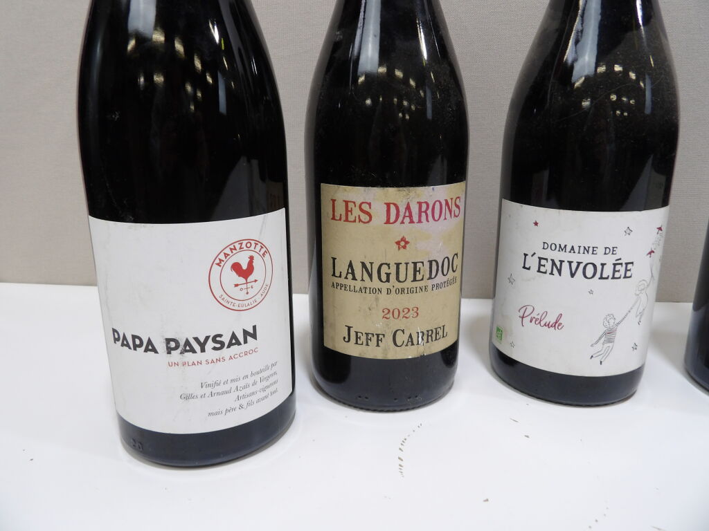 VINS ROUGE du Sud ensoleillé LANGUEDOC et PAYS d'OC x6 bouteilles : x1 Chateau Paul Mas Languedoc 2023, x1 Un bon petit rouge entre copains Les vignes du vent 2023, x1 Chemin de Moscou 2021, x1 Domaine de L'Envolée prélude 2023, x1 Les DARONS Languedoc 2023, et x1 MANZOTTE Papa Paysan 2021.